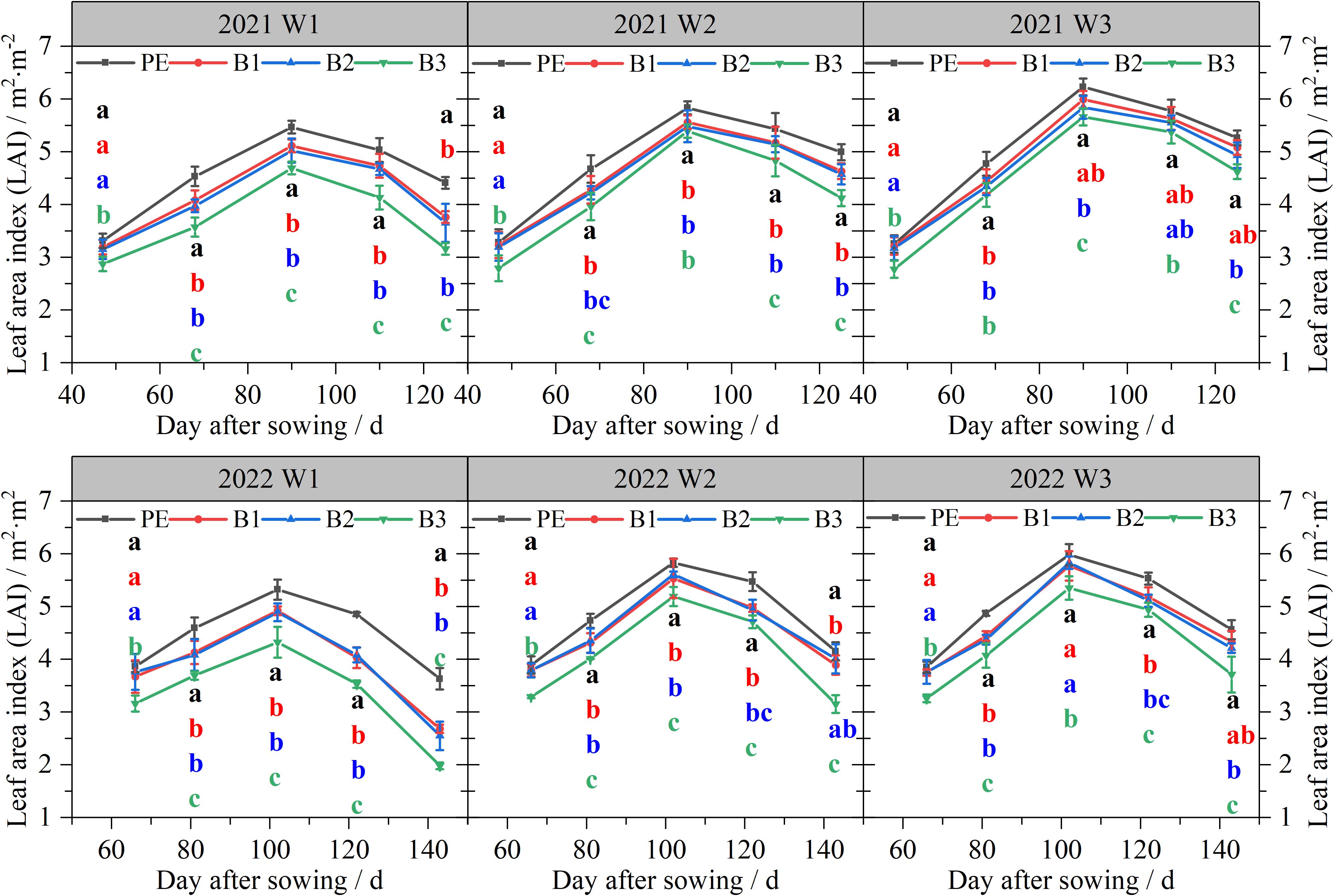 Figure 7. Dynamic changes in the LAI of cotton under different mulching types and irrigation depths in 2021 and 2022. W1: 315 mm (63.6% ET0); W2: 405 mm (81.8% ET0); and W3: 495 mm (100% ET0). PE: polyethylene mulch film; B1: Fully biodegradable mulch; B2: Thermo-oxygen-biodegradable mulch; B3: Fully biodegradable mulch. Different letters indicate significant differences at the 5% level.