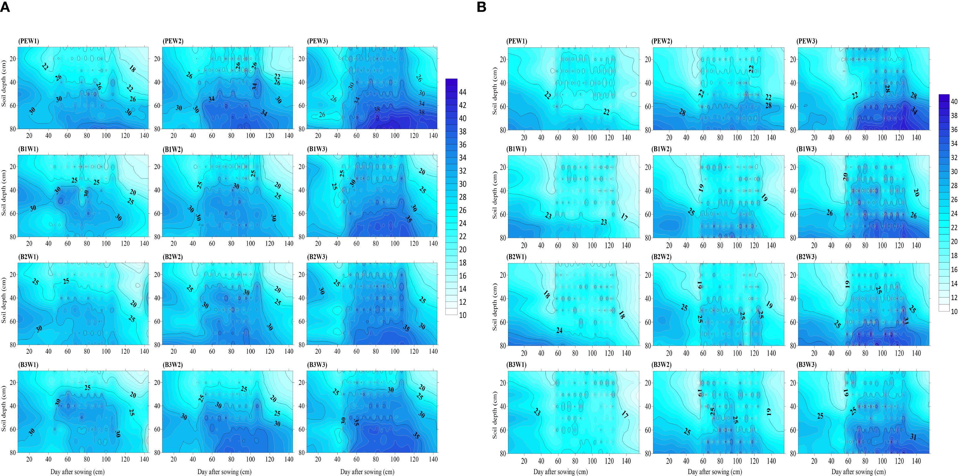 The moisture content of the surface soil significant fluctuates due to the dual influences of plant root absorption and surface evaporation (Liebhard et al., 2022; Fang et al., 2022). During specific growth stages, crops experiencing water stress may benefit from moderate irrigation, which can induce a compensatory growth effect. However, excessive irrigation negates this compensatory effect and leads to adverse phenomena such as delayed maturation and excessive vegetative growth (Cui et al., 2015; Comas et al., 2019). Excessive irrigation may trigger excessive vegetative growth and delay maturity. These findings align with previous research, indicating that biodegradable film degradation begins during the cotton flowering stage, weakening its moisture retention capability and resulting in a lower soil moisture content compared to the control PE film. However, under W3, the soil moisture content in the 0–30 cm layer increased across all treatments, particularly for B1, which exhibited a 3.72% higher moisture content than the control PE film. This suggests that increasing the irrigation depth enhances the lateral movement of soil moisture beneath the biodegradable film, leading to moisture accumulation in the upper soil layers and reducing ineffective water, which facilitates efficient water use. Under PE mulch in 2022, the soil moisture content in the 50–80 cm layer at the W3 irrigation depth registered 33.55%, representing increases of 19.62% and 63.06% compared to W2 and W1, respectively. This may be because the non-degradable PE film enhanced its vertical moisture movement capacity with increased irrigation depth, which results in a higher moisture level in the lower soil layers. Contributing to excessive vegetative growth in cotton bolls and consequently reducing yield.