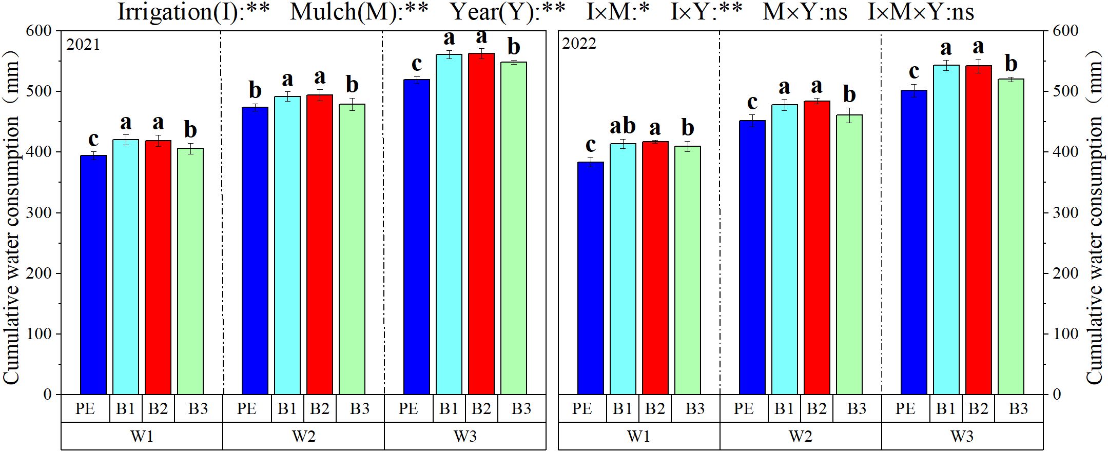 Figure 9. Water consumption changes in cotton fields in 2021 and 2022. W1: 315 mm (63.6% ET0); W2: 405 mm (81.8% ET0); and W3: 495 mm (100% ET0). PE: polyethylene mulch film; B1: Fully biodegradable mulch; B2: Thermo-oxygen-biodegradable mulch; B3: Fully biodegradable mulch. Different letters indicate significant differences at the 5% level. * and ** represent a significant difference at the 5 and 1% levels.