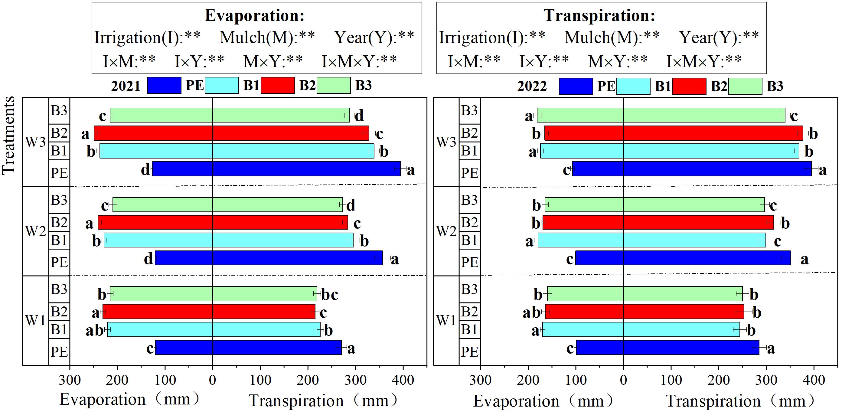 Figure 10. Changes of soil evaporation and plant transpiration at four main growth stages of cotton under different treatments. W1: 315 mm (63.6% ET0); W2: 405 mm (81.8% ET0); and W3: 495 mm (100% ET0). PE: polyethylene mulch film; B1: Fully biodegradable mulch; B2: Thermo-oxygen-biodegradable mulch; B3: Fully biodegradable mulch. Different letters indicate significant differences at the 5% level. ** represent a significant at the 1% levels.