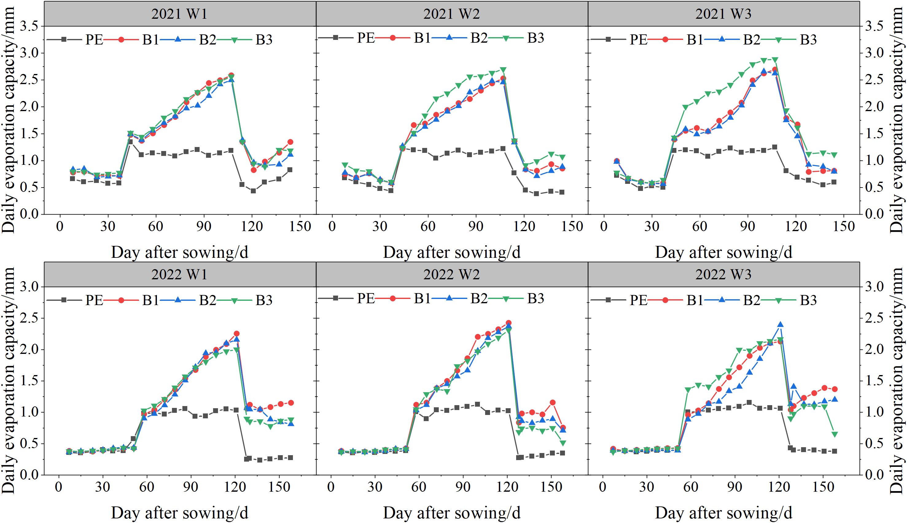Figure 11. Stage changes of daily soil evaporation under different treatments. W1: 315 mm (63.6% ET0); W2: 405 mm (81.8% ET0); and W3: 495 mm (100% ET0). PE: polyethylene mulch film; B1: Fully biodegradable mulch; B2: Thermo-oxygen-biodegradable mulch; B3: Fully biodegradable mulch.