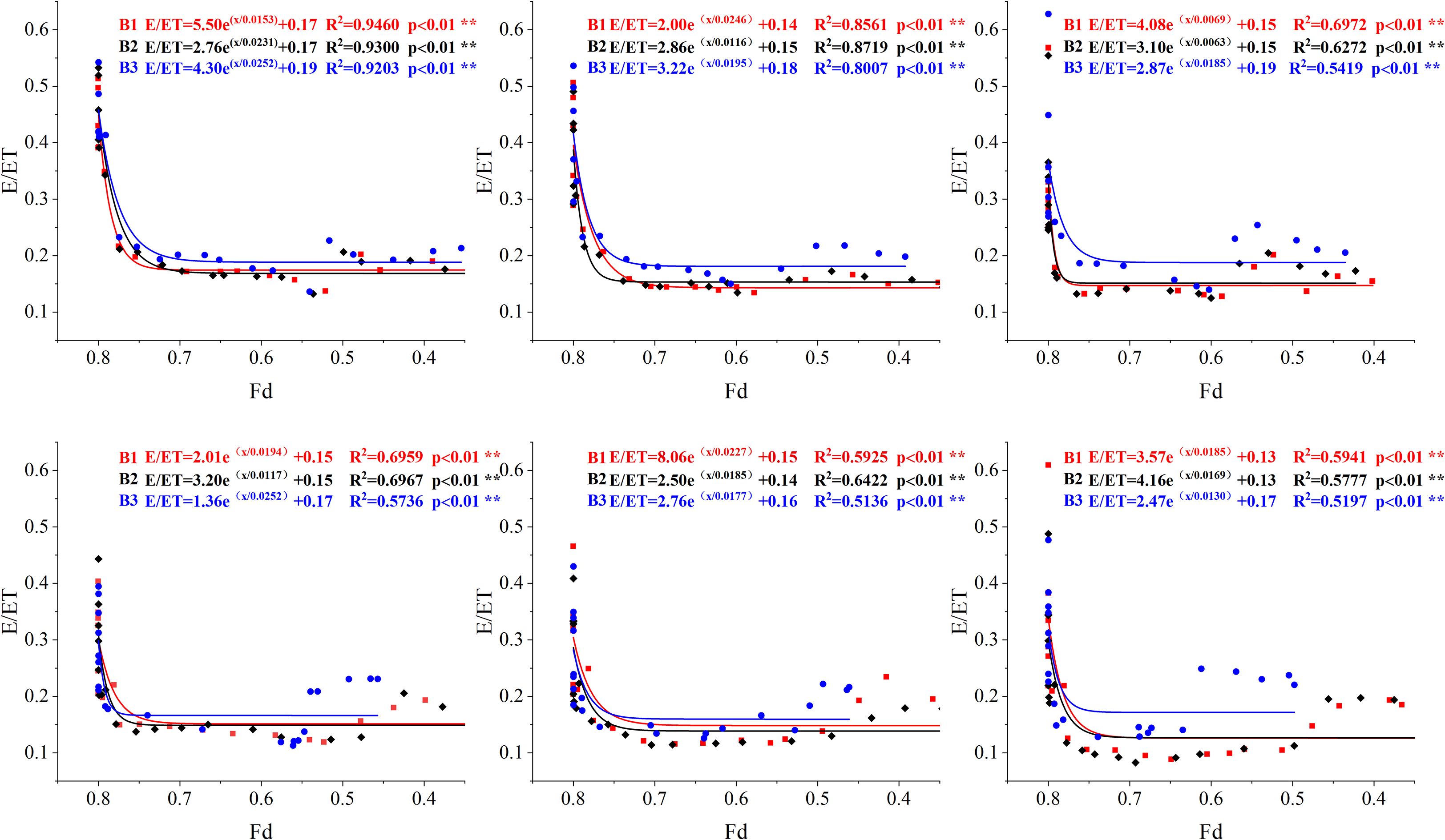 Figure 12. Dynamic relationship between E/ET and Fd (fraction of the disintegrated) under biodegradable mulching. W1: 315 mm (63.6% ET0); W2: 405 mm (81.8% ET0); and W3: 495 mm (100% ET0). PE: polyethylene mulch film; B1: Fully biodegradable mulch; B2: Thermo-oxygen-biodegradable mulch; B3: Fully biodegradable mulch. ** represent a significant at the 1% levels.
