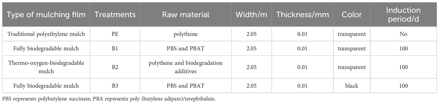 Based on the four functions of “temperature increase, moisture preservation, salt suppression, and grass suppression,” mulching technology has mitigated problems encountered in cotton planting in Xinjiang, such as recurrent low temperatures and high winds in the spring, seasonal unevenness resulting in water shortages, and heavy soil salinization. Thus, mulching has been widely adopted across the cotton-growing regions of Xinjiang (Qi et al., 2021; Zong et al., 2021). Nevertheless, current technologies for plastic film recovery are insufficient to fully eliminate the conventional plastic mulch used in agricultural fields (He et al., 2018), leading to the persistent accumulation of considerable plastic debris in the soil plow layer. This adversely affects cotton yield development and poses a threat of irreversible harm to farmland ecosystems (Gao et al., 2019). Thus, environmentally benign biodegradable mulch films have emerged as a promising alternative (Liu et al., 2022). These materials are predominantly fabricated from bio-based polymers, such as polylactic acid (PLA) and polyhydroxyalkanoates (PHA), and natural macromolecules, such as starch and cellulose. They are designed to progressively decompose into CO2, H2O, and biomass (Brodhagen et al., 2015; De Sadeleer and Woodhouse, 2024), preventing the long-term accumulation of plastic fragments in the soil (Touchaleaume et al., 2016; Yin et al., 2019). However, a significant challenge remains, as the mechanical strength and degradation of such biodegradable mulch films often fall short of agricultural requirements. To enhance both their degradability and physical performance, certain products incorporate photosensitizers and polyethylene as additives (Song et al., 2024). Although this approach can partially improve film functionality, it introduces new concerns, including inconsistent degradation performance and decomposition outcomes. These uncertainties impede the accurate assessment of field-scale water consumption under film mulching, which complicates irrigation management and water resource planning.