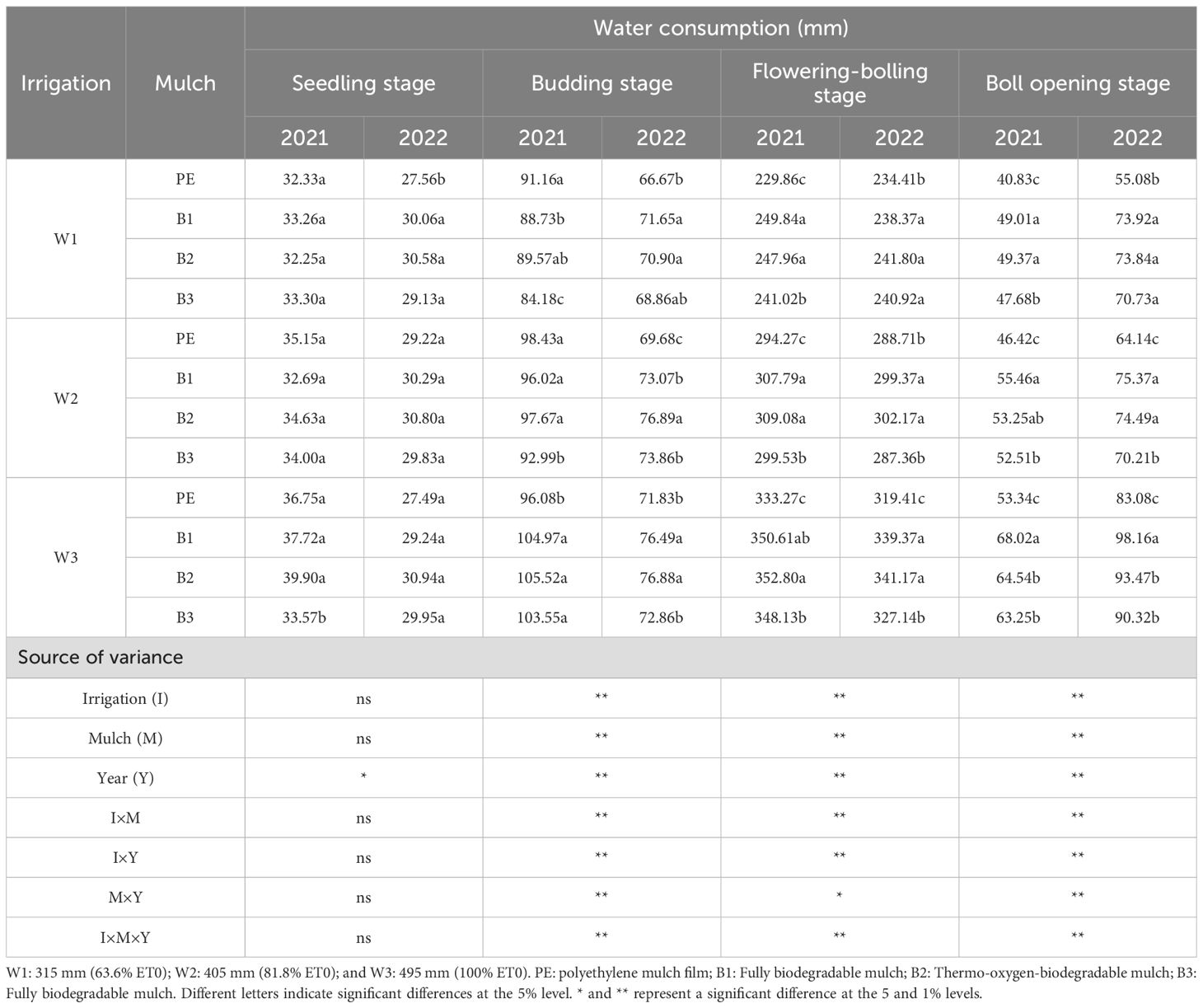 Table 4. Changes in water consumption and cotton in 4 growth stages under different mulch and irrigation treatments in 2021 and 2022.