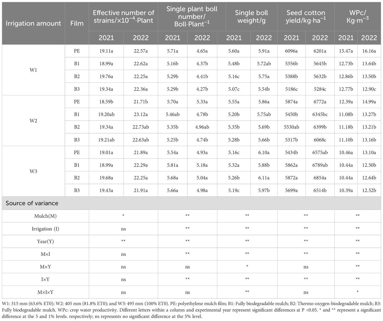 Furthermore, preliminary findings of this study demonstrate that although biodegradable mulch films involve higher production costs, they eliminate subsequent expenses associated with retrieval and disposal (Zhang et al., 2025). By applying an optimized irrigation depth of 495 mm, the yield risks potentially induced by premature degradation can be fully mitigated, thereby establishing economic feasibility. More importantly, from an environmental perspective, fully biodegradable mulch film (B1) fundamentally eliminates the long-term adverse effects of plastic residues on soil structure, microbial activity, and crop root development, thereby preventing irreversible damage to farmland ecosystems caused by “white pollution”. Hence, under the optimized W3 irrigation regime, the adoption of biodegradable mulch film represents a strategic approach that harmonizes short-term economic benefits with long-term environmental sustainability. However, the implementation of this strategy must take into account local water resources and their utilization efficiency. To that end, our subsequent research will focus on employing more precise irrigation scheduling to target limited water resources specifically during the mid-to-late growth stages, when cotton is most sensitive to water availability. The objective is to further reduce irrigation depth without compromising yield in cotton fields using biodegradable mulch, thereby addressing severe water scarcity challenges.