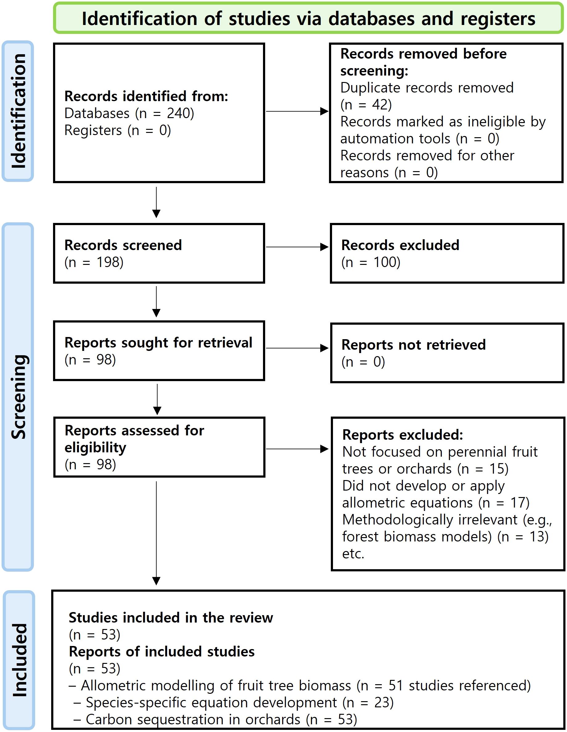A three-stage screening process was applied to ensure that only studies directly relevant to perennial fruit-tree biomass modeling were included. In the identification stage, titles and abstracts were reviewed to determine topical relevance. During the screening stage, full-text articles that explicitly developed or applied allometric equations to perennial fruit-tree crops were retained. Finally, in the eligibility stage, studies focusing solely on forest ecosystems or annual crops were excluded. From an initial pool of approximately 240 records, 53 studies met all inclusion criteria and were selected for review. These studies were subsequently classified into three thematic domains: (i) biometric modeling of fruit-tree biomass, (ii) development of species-specific allometric equations, and (iii) carbon-sequestration potential in orchard systems.