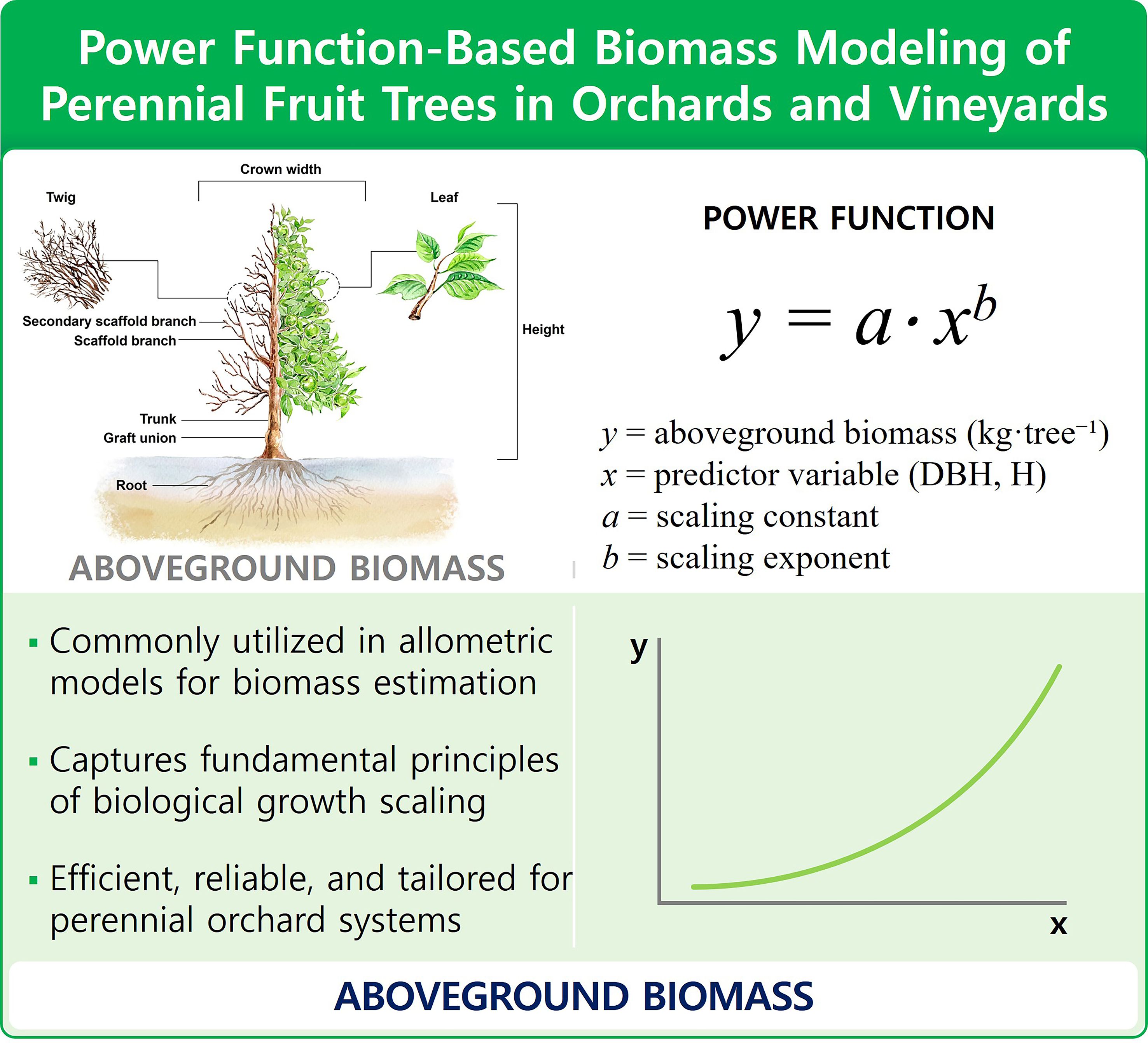 Figure 2. Conceptual framework for applying power functions in biomass estimation of perennial fruit trees in orchards and vineyards. The diagram illustrates how power-law allometric equations (e.g., y=a·xb) are used to estimate aboveground biomass using biometric variables such as diameter at breast height (DBH) and tree height (H). Power functions are widely adopted in orchard carbon modeling due to their alignment with biological growth scaling, efficiency in field applications, and adaptability to species-specific orchard architectures.
