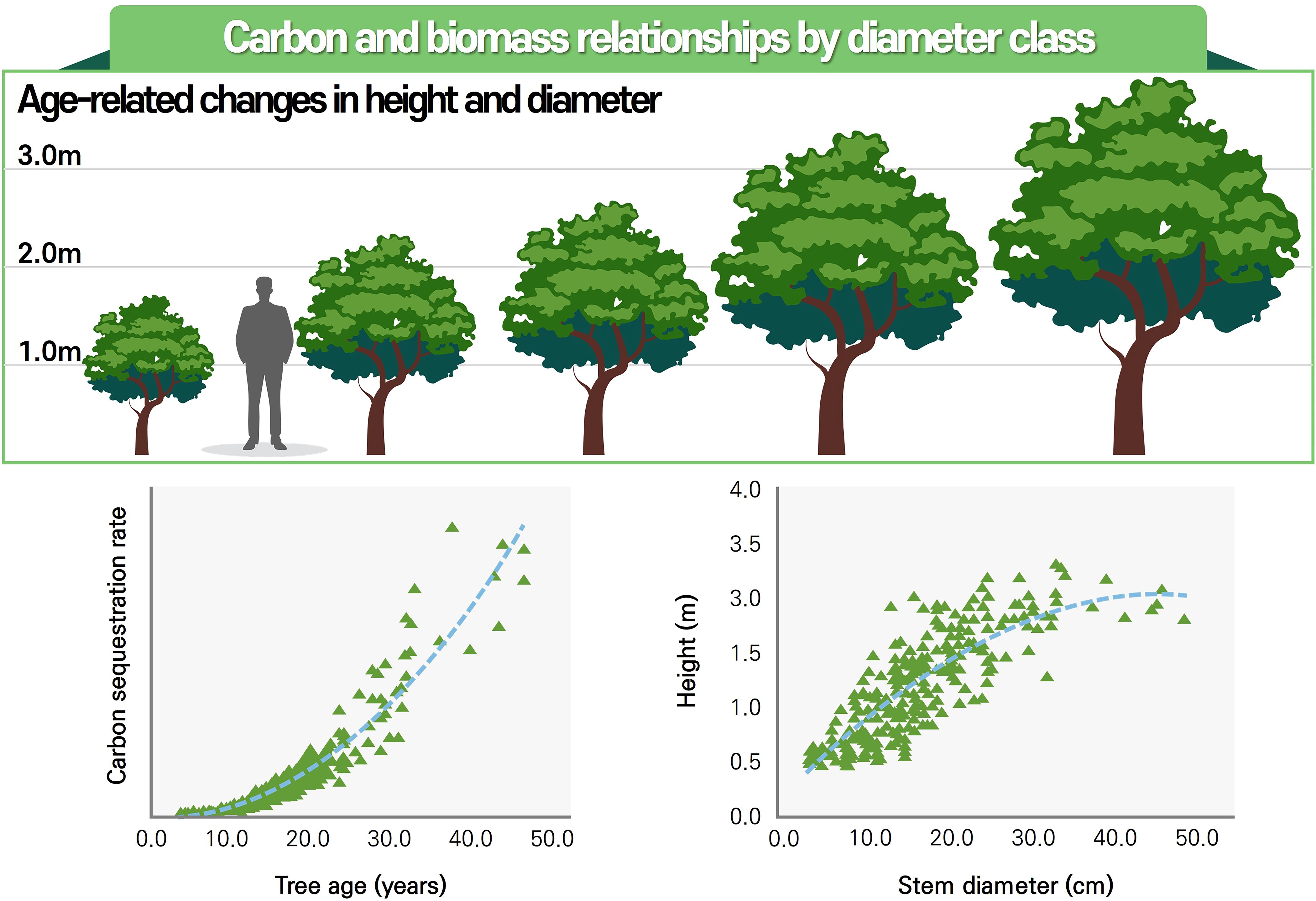 Among the tools used in Tier 2 estimation, allometric equations are particularly essential. These equations define relationships between readily measurable biometric variables—such as diameter at breast height (DBH), tree height, and canopy volume—and aboveground biomass, thereby enabling non-destructive estimation of carbon stocks. This approach is widely regarded as one of the most reliable methods for quantifying carbon at both the individual tree and site scales (Ioannidou et al., 2025; Walker et al., 2016). Figure 2 shows how tree diameter and height change across developmental stages, and how these biometric attributes are used in allometric modeling to estimate biomass and carbon stocks. The bottom panels depict the application of power function–based regression models that relate stem diameter to aboveground biomass accumulation. This visual integration helps reinforce the empirical basis of carbon estimation methods under Tier 2 and Tier 3 approaches.