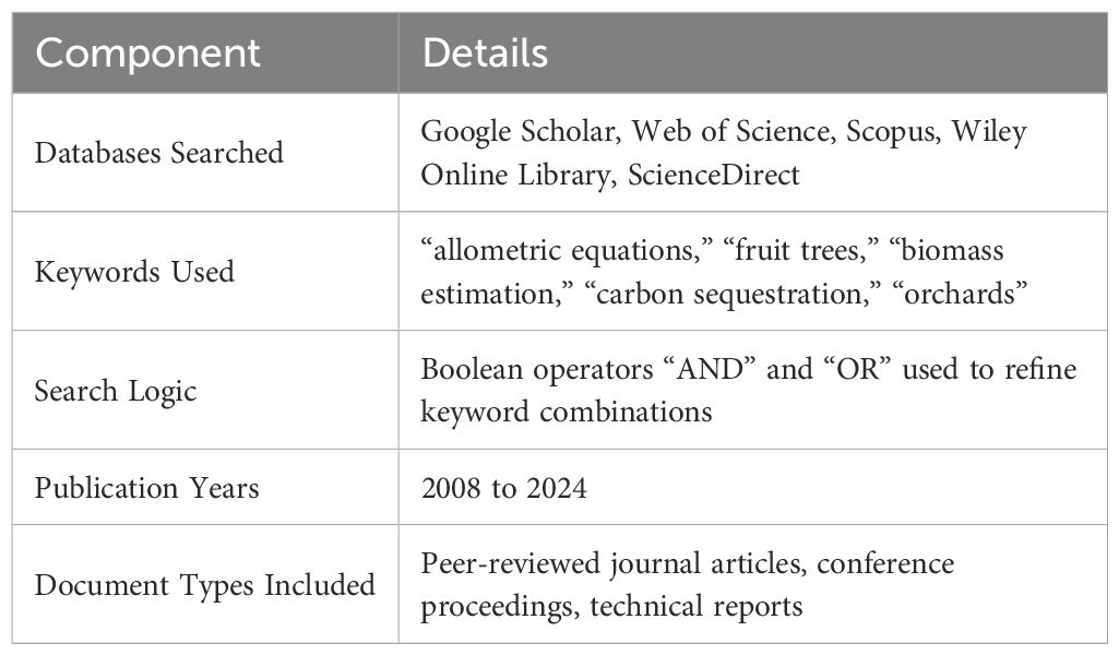 A systematic literature search was conducted to identify peer−reviewed studies aligned with the review’s scope, specifically focusing on biomass estimation, allometric modeling, and carbon sequestration in perennial fruit−tree systems. Databases included Google Scholar, Web of Science, Scopus, Wiley Online Library, and ScienceDirect, selected for their comprehensive coverage of environmental science, forestry, and agricultural literature. The search covered the period from January 1, 2008, to December 31, 2024, and was restricted to English-language publications only (see Table 1 for full query details). Search strings combined key terms such as “allometric equations” AND “fruit trees”, “biomass estimation” AND “orchards”, and “carbon sequestration” AND (“vineyards” OR “perennial fruit crops”), using Boolean operators (“AND”, “OR”) and, where applicable, truncation to capture word variants. Screening and data−extraction tasks were conducted independently by three team members (the lead author and two co−authors), and any discrepancies were resolved through joint discussion and consensus.