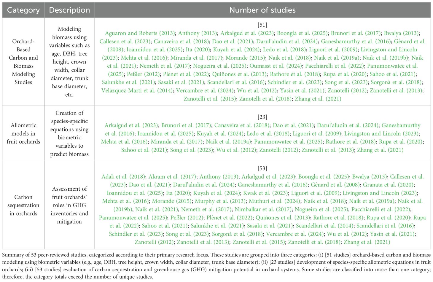 Table 2. Categorized literature survey on allometric modeling and carbon sequestration in fruit orchards.