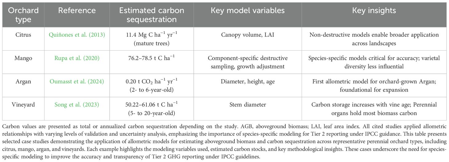 Table 3 presents a comparative summary of recent case studies that have developed or applied allometric biomass models to estimate carbon sequestration in perennial orchard systems. These studies span a wide range of climates, species, and management practices—including citrus, mango, argan, and grapevine systems—demonstrating both the methodological diversity and ongoing progress in integrating orchard systems into national carbon accounting frameworks (Oumasst et al., 2024; Quiñones et al., 2013; Rupa et al., 2020; Zhang et al., 2021; Song et al., 2023).