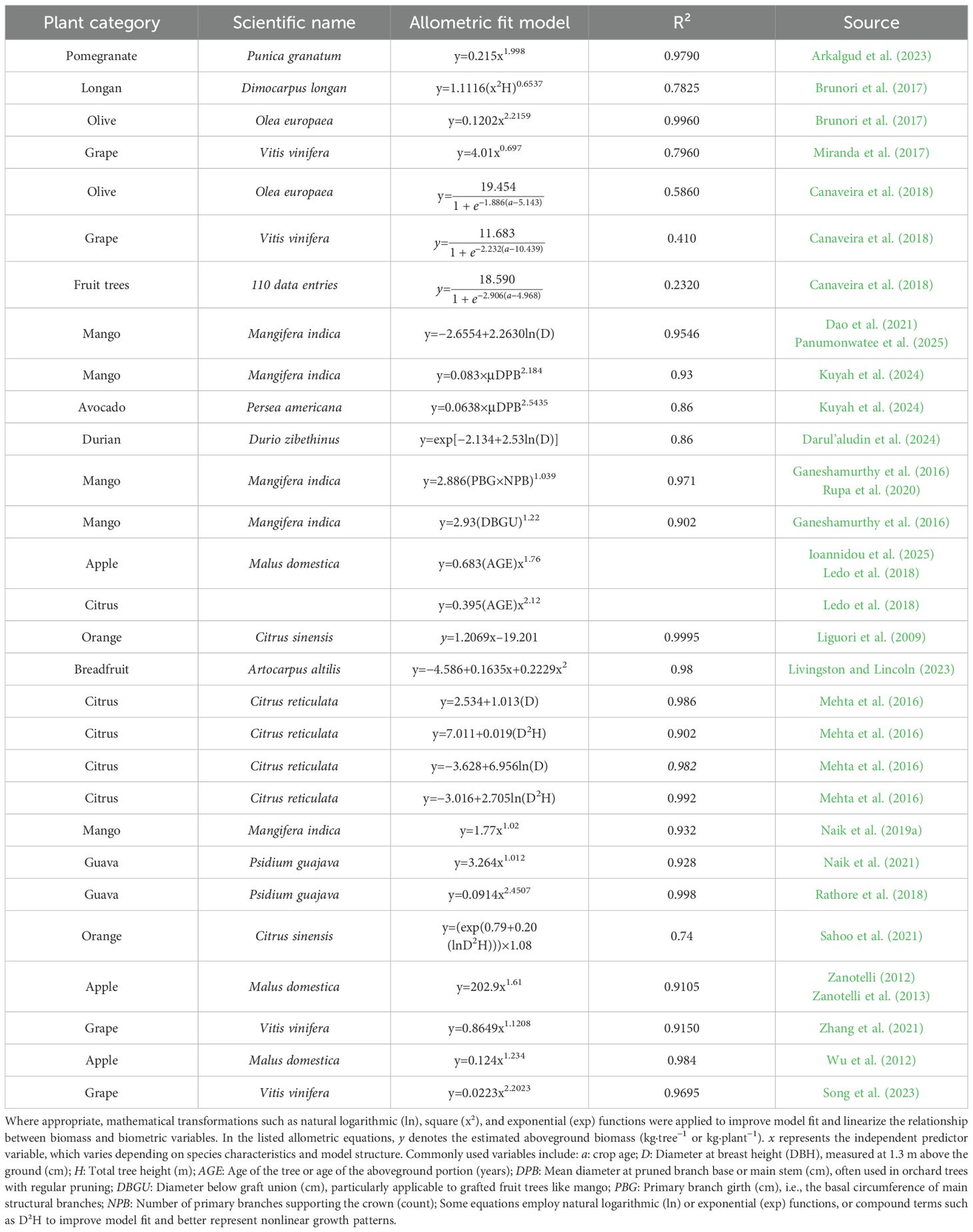 Out of these, 23 studies specifically focused on the development of species-specific allometric equations, highlighting a growing effort to improve model precision by accounting for species-specific architecture, management practices, and growing environments (e.g., Arkalgud et al., 2023; Dao et al., 2021; Rathore et al., 2018). These models frequently adopt power functions or other nonlinear regression forms, which have proven effective in capturing the growth dynamics of fruit-bearing trees.