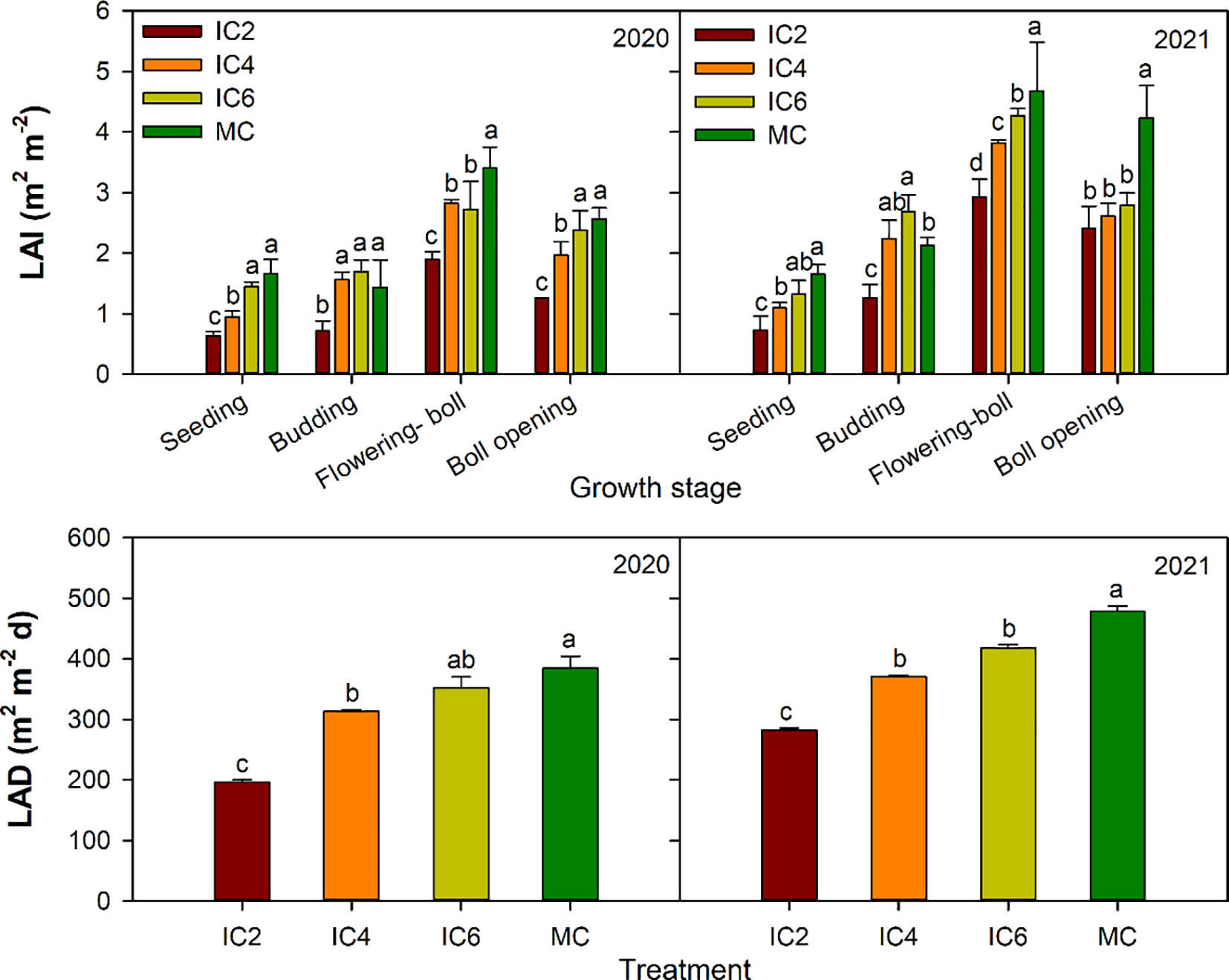 Figure 2. Leaf area index (LAI) and at different growth stages leaf area duration (LAD) under different treatments in 2020 and 2021. IC2, IC4, and IC6 represent jujube intercropped with two, four, and six rows of cotton; MC, monoculture cotton. Different lowercase letters indicate significant differences among treatments at p< 0.05.