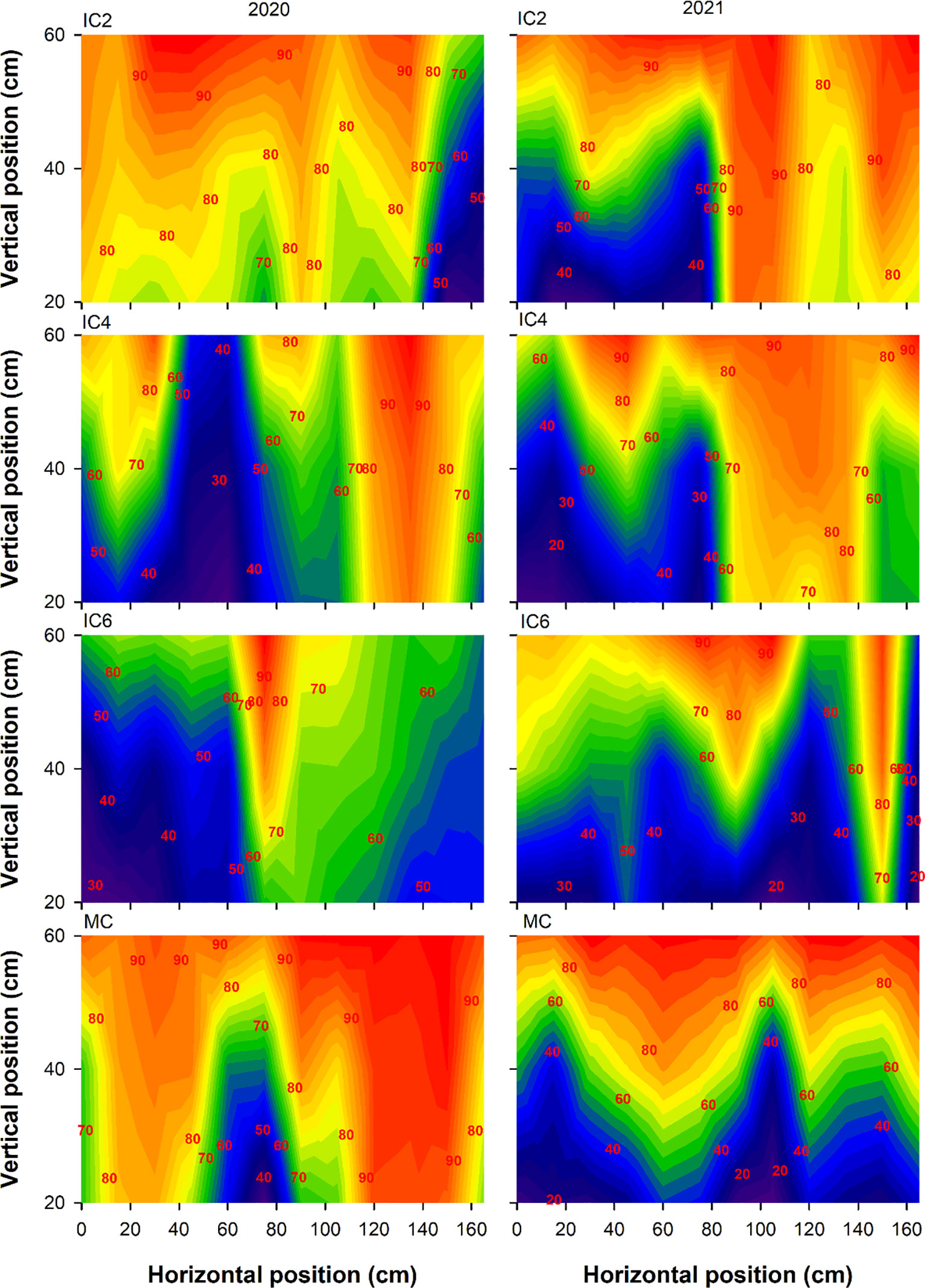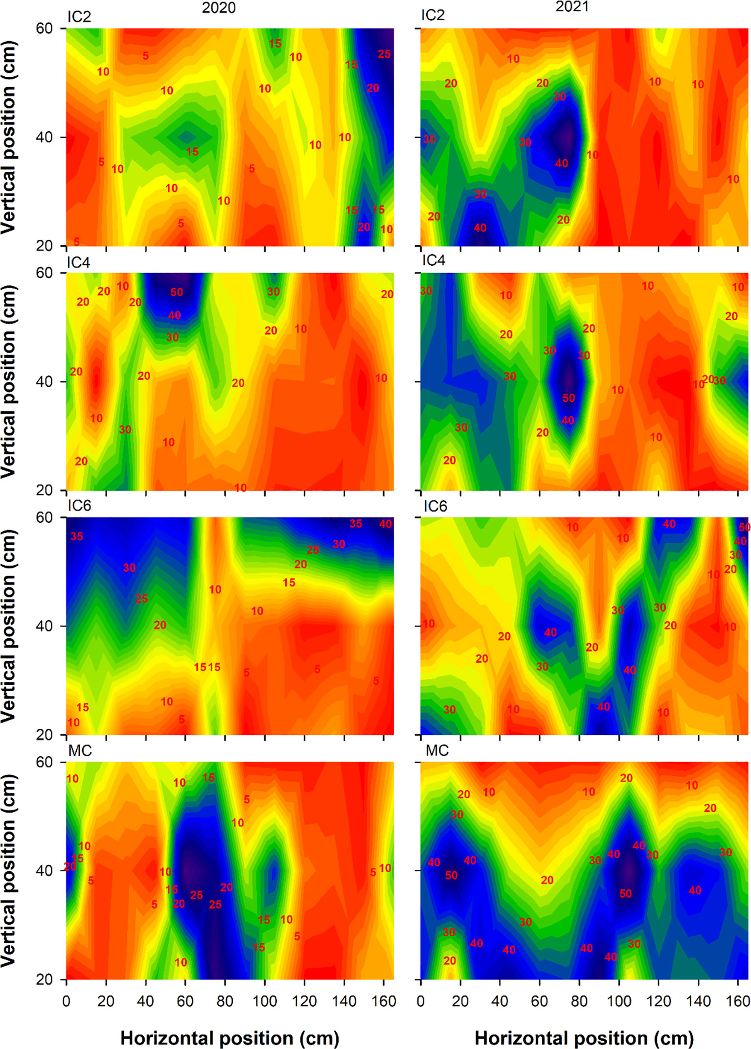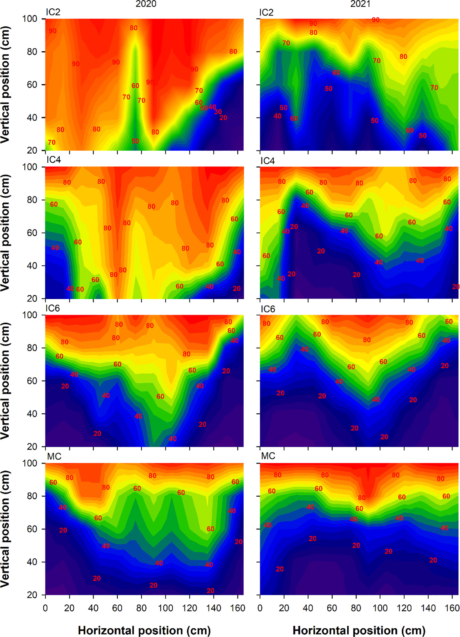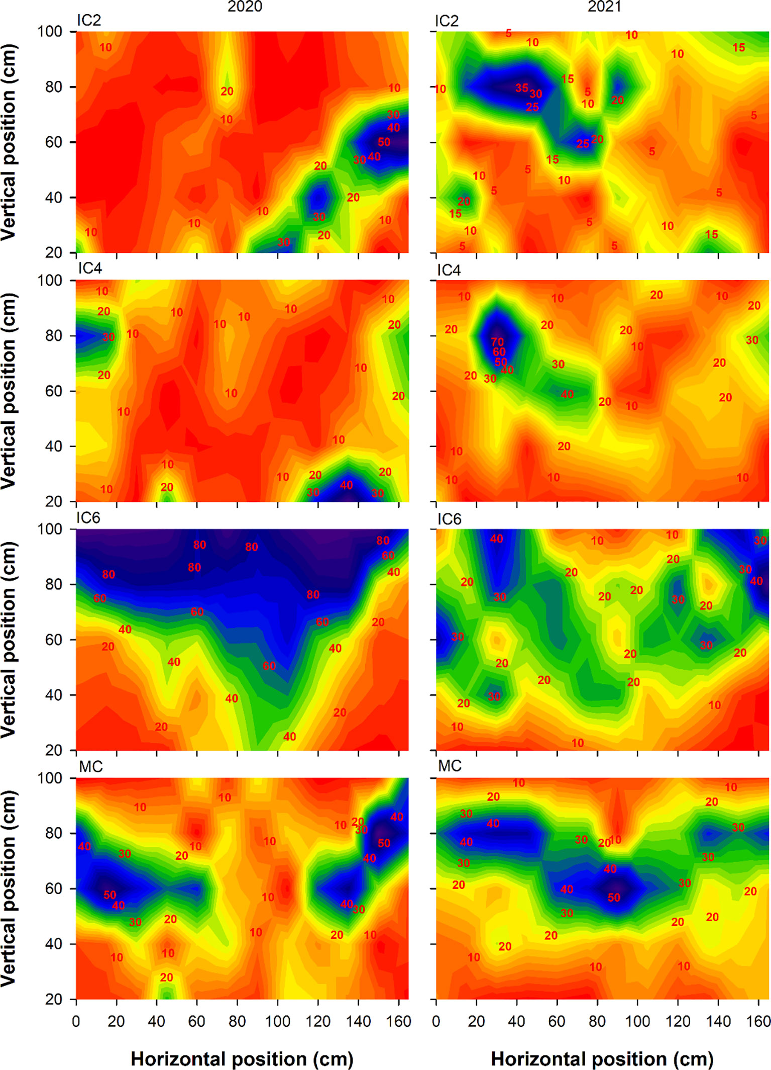 Figure 4. Transmitted PAR rate (%) at the flowering-boll stage under different treatments in 2020 and 2021. IC2, IC4, and IC6 represent jujube intercropped with two, four, and six rows of cotton; MC, monoculture cotton.