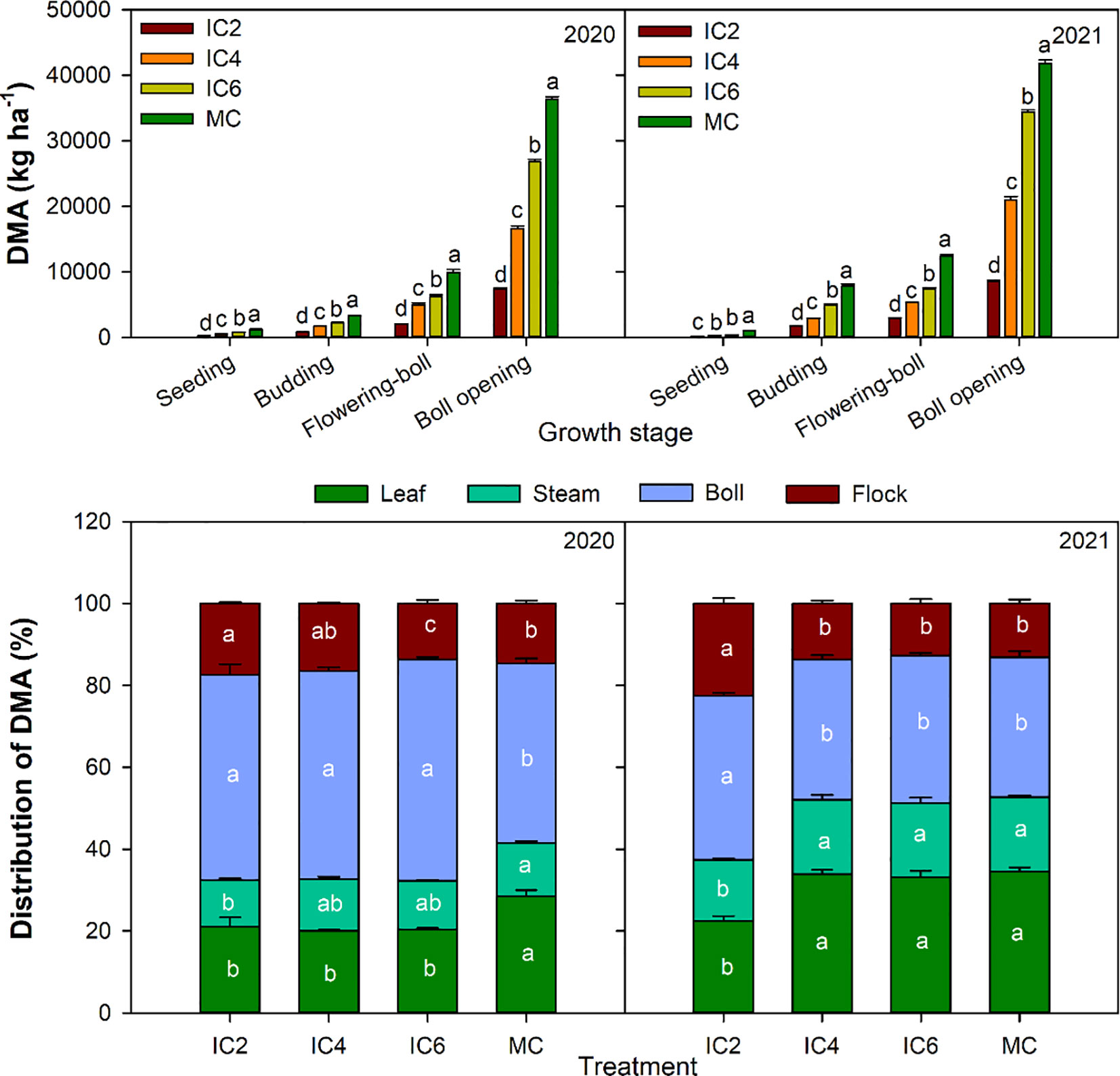Compared to MC, the mean DMA under IC2, IC4, and IC6 showed significant decreases of 79.0%, 52.0%, and 28.8%, in 2020 and 78.6%, 53.1%, and 25.2%, in 2021, respectively (Figure 7). Across both years, the mean DMA under IC2 and IC4 was significantly reduced by 71.0% and 35.6% compared to IC6, under IC2 showed a significant decrease of 54.9% compared to IC4. Compared to MC, IC2, IC4, and IC6 reduced stem and leaf allocation at the boll opening stage of cotton but increased the boll allocation ratio in 2020. In 2021, boll allocation under IC2 significantly increased by 30.5%, 28.4%, and 32.5%, compared to the MC, IC4, and IC6 treatments, respectively. Concurrently, the stem and leaf allocation under IC2 significantly decreased by 28.1%, 27.0%, and 29.1% compared to the MC, IC4, and IC6 treatments, respectively.