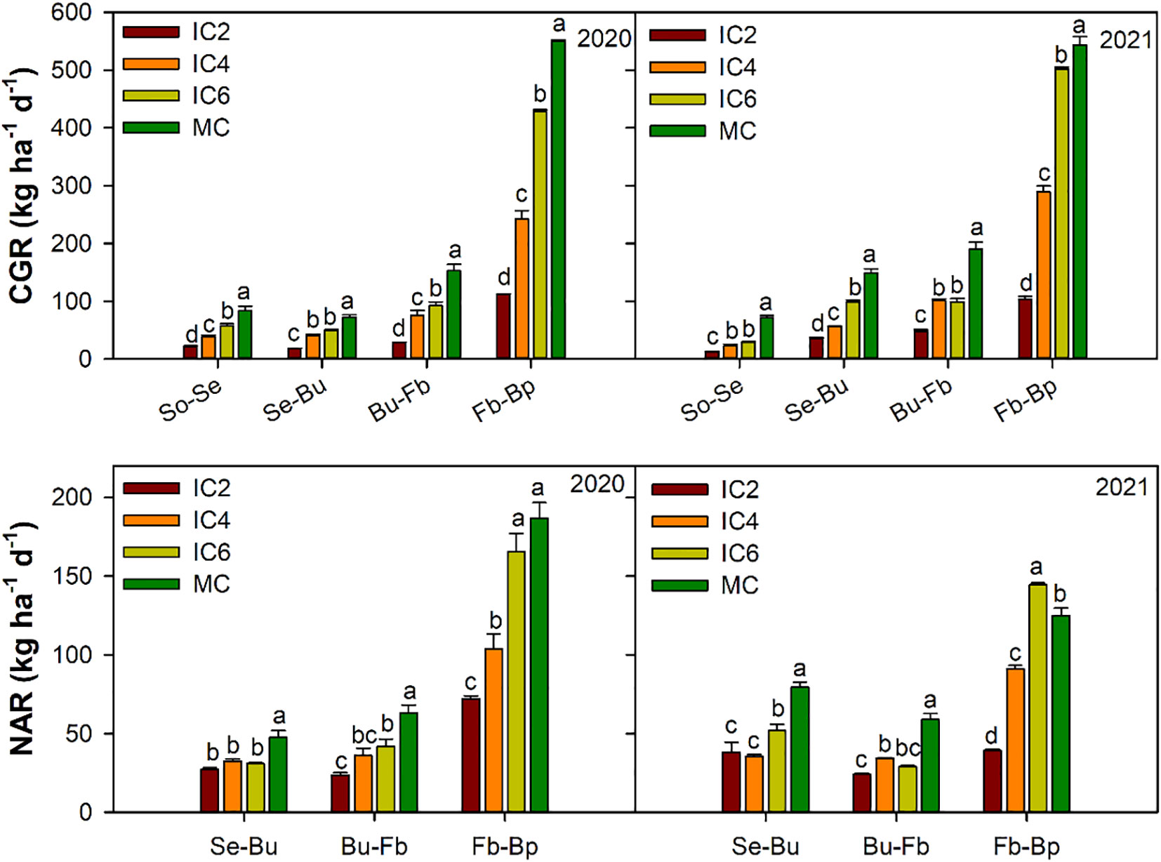 Compared to MC, the CGR under IC2, IC4, and IC6 treatments significantly decreased by approximately 79%, 54%, and 27% in 2020 and by 79%, 51%, and 24%in 2021, respectively (Figure 8). Similarly, the NAR significantly decreased by 59%, 42%, and 19% in 2020and by 61%, 39%, and 14% in 2021, respectively. Compared to IC6, CGR was significantly reduced by 71% and 37% in 2020 and by 73% and 36% in 2021 under IC2 and IC4 treatments, respectively; NAR was significantly reduced by 48% and 28% in 2020, by 55% and 29% in 2021, respectively. In addition, the CGR and NAR under IC2 were significantly lower than those under IC4 by 55% and 29% in 2020, by 57% and 37%in 2021, respectively.