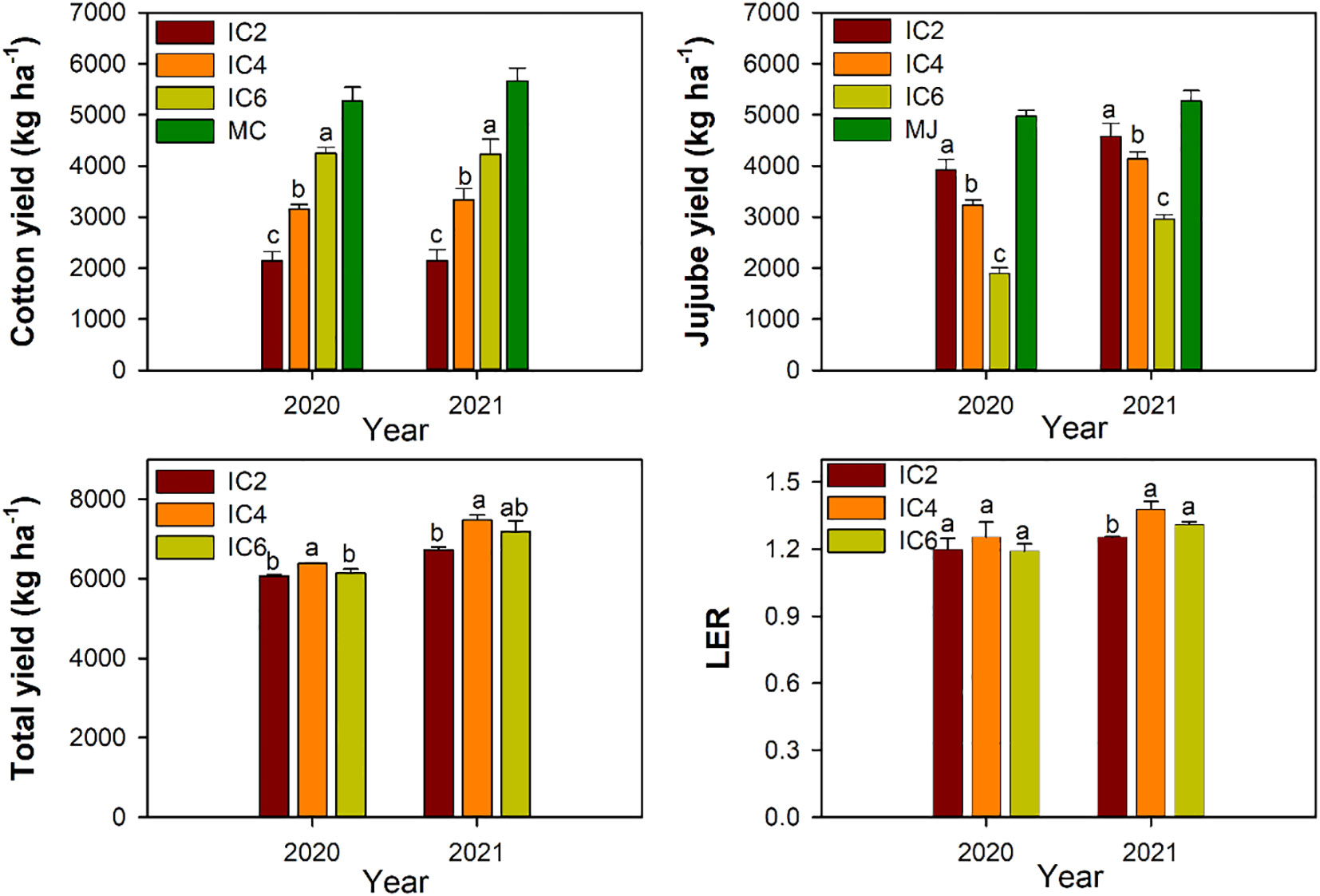 Figure 9. Yield and land equivalent ratio (LER) under different treatments in 2020 and 2021. IC2, IC4, and IC6 represent jujube intercropped with two, four, and six rows of cotton; MC, monoculture cotton. MJ, monoculture jujube. Different lowercase letters indicate significant differences among treatments at p < 0.05.