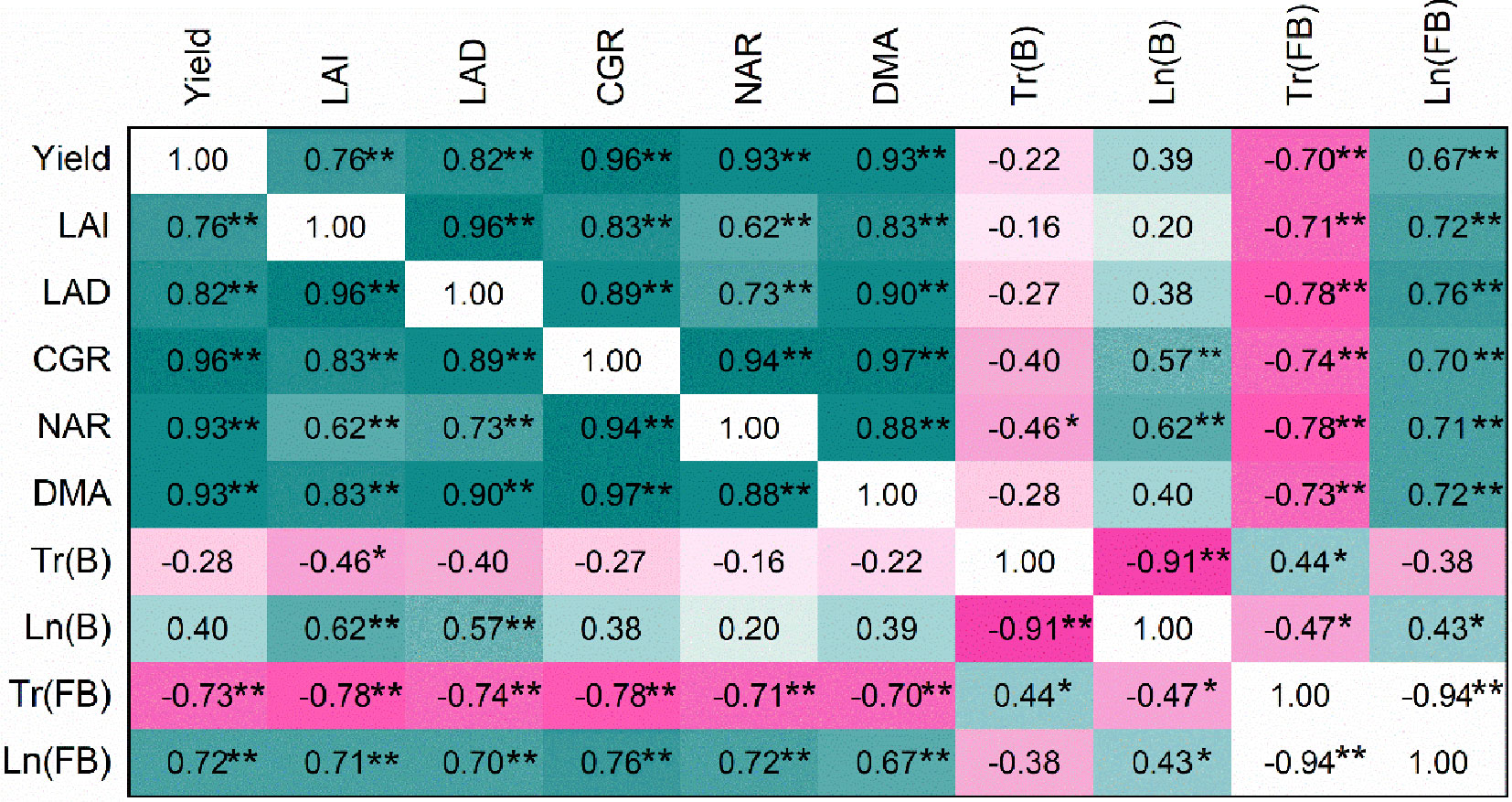 Figure 10. Relationships among cotton yield, growth characteristics, and photosynthetically active radiation. LAI, leaf area index; LAD, leaf area duration; CGR, crop growth rate; NAR, net assimilation rate; DMA, dry matter accumulation; Tr(B), Transmitted PAR rate at the boll stage; LN (B), Intercepted PAR rate at the boll stage; Tr (FB), Transmitted PAR rate at the flowering–boll stage; LN(B), Intercepted PAR rate at the flowering–boll stage. *p < 0.05; **p < 0.01.