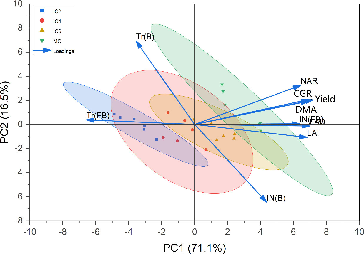 Figure 11. Principal component analysis among cotton yield, growth characteristics, and photosynthetically active radiation. LAI, leaf area index; LAD, leaf area duration; CGR, crop growth rate; NAR, net assimilation rate; DMA, dry matter accumulation; Tr (B), Transmitted PAR rate at the budding stage; LN (B), Intercepted PAR rate at the budding stage; Tr (FB), Transmitted PAR rate at the flowering–boll stage; LN (FB), Intercepted PAR rate at the flowering–boll stage.