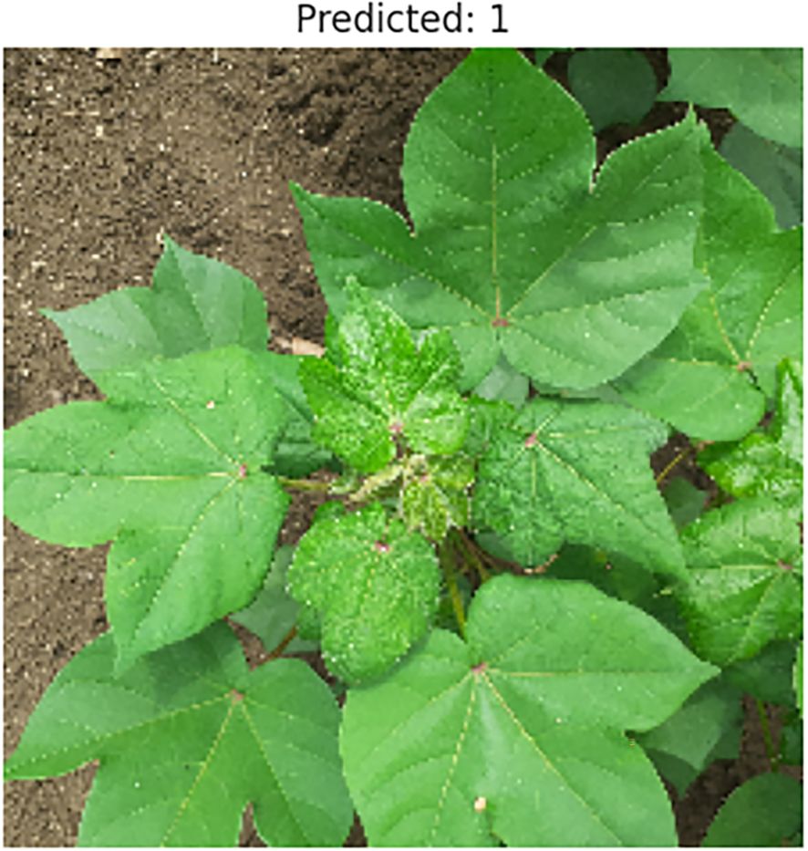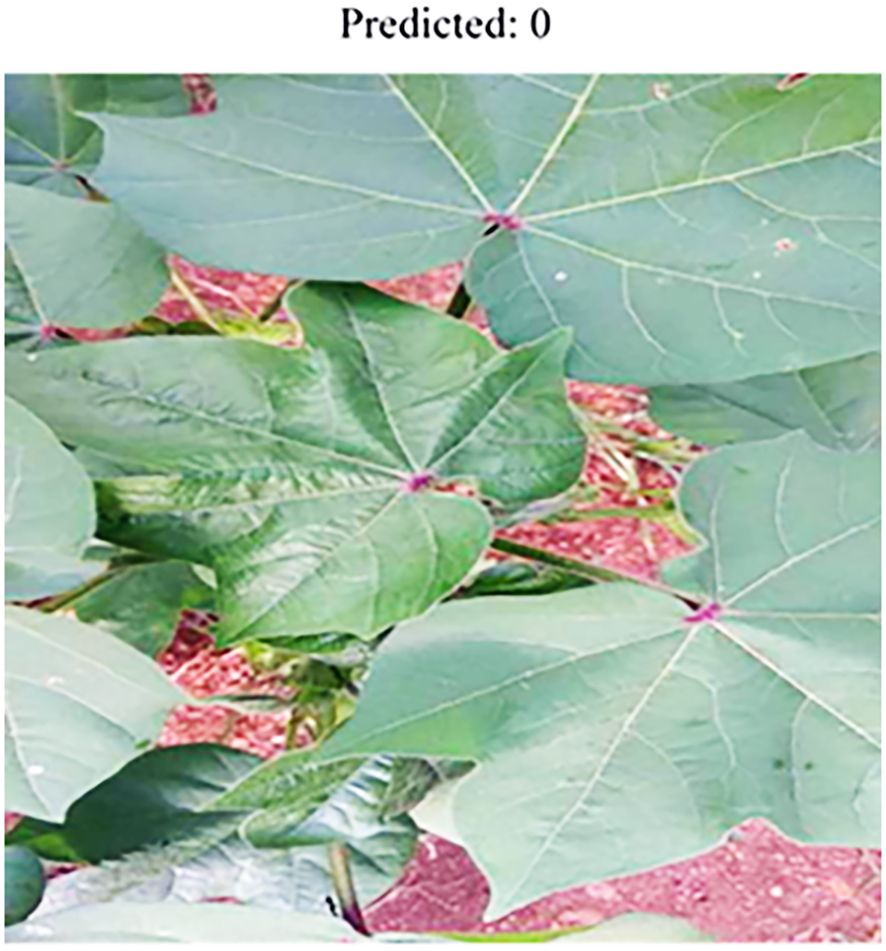 By adding more data sources to the proposed model, it can be made for practical deployment by integrating additional data sources, Cotton Disease Plants Dataset (Serosh Karim, Kaggle), to facilitate real-time detection of cotton diseases and improve reliability under varying field conditions. Images depicted in Figures 7 and 8 outline the predicted classes 0 and 1.