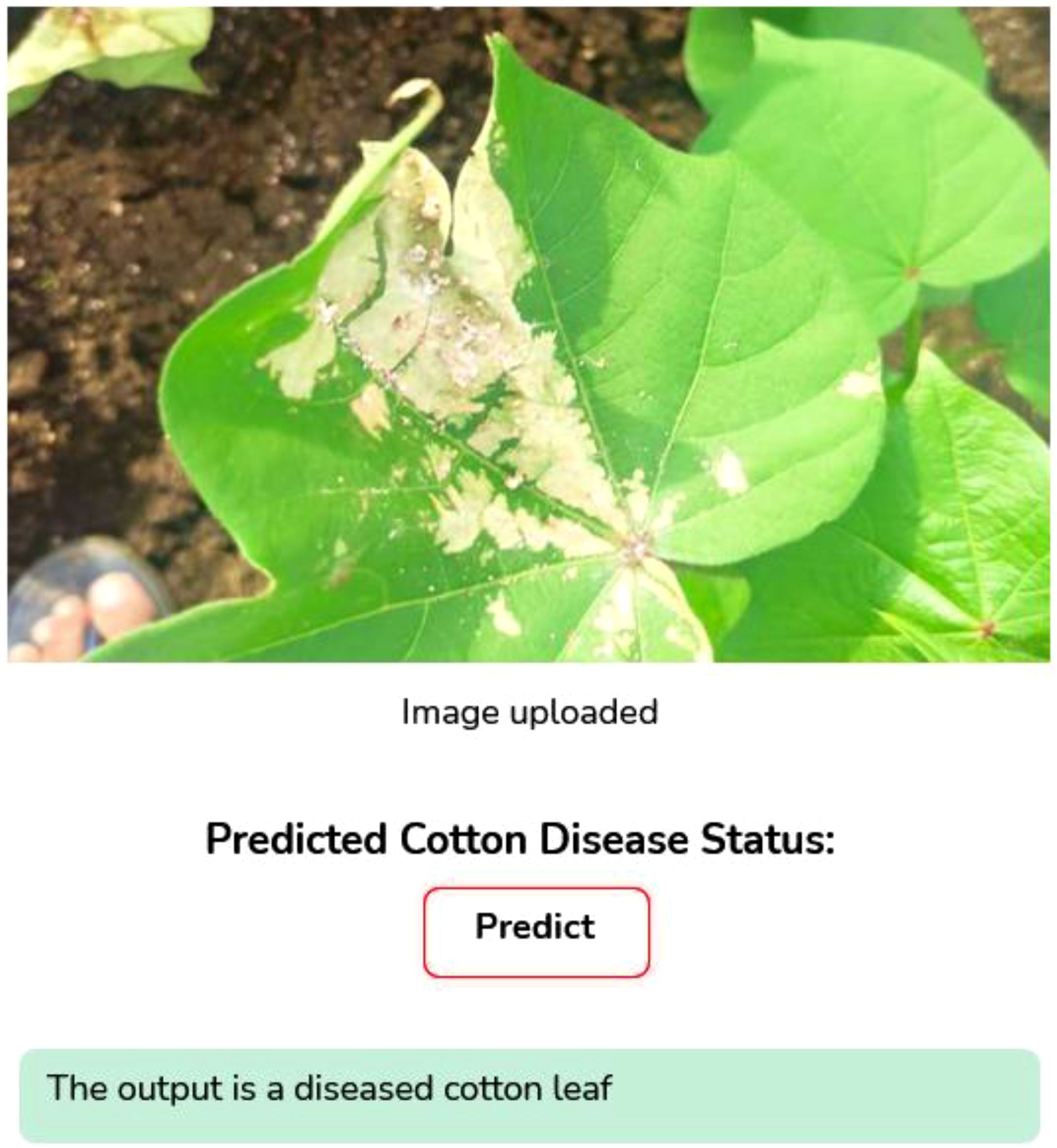 ● Web application Development: We have developed a web application using a Python framework, namely Flask, for deployment and runs DL based applications. This web application is capable of identifying cotton disease leaves and plants from healthy leaves and plants based on real-time data.