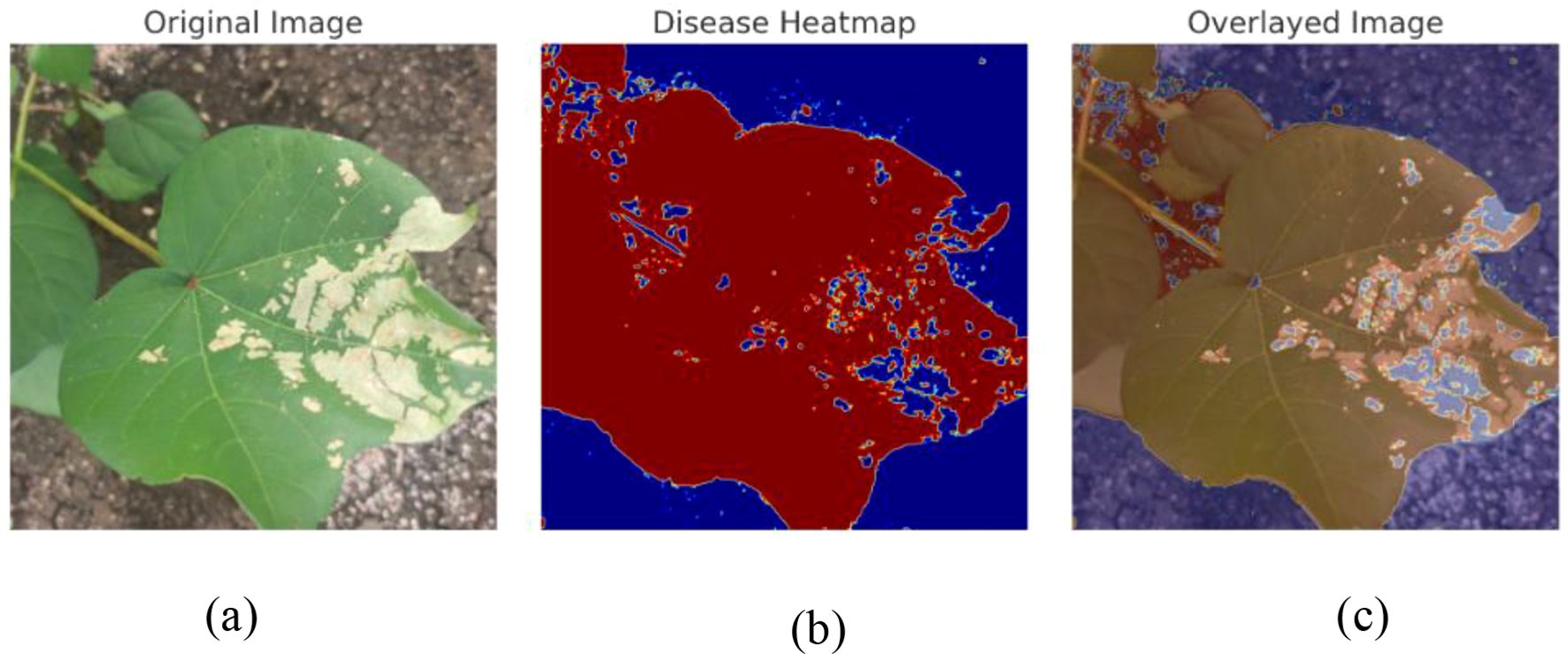 The interpretability of the convolutional neural network was enhanced using the Gradient-Weighted Class Activation Mapping (Grad-CAM) method. This technique generates heatmaps that highlight the regions of an image most influential in the model’s decision-making process, thereby providing transparency in classification outcomes. By localizing the critical areas that contribute to class prediction, Grad-CAM enables a clearer understanding of how the model distinguishes between categories. Beyond validating prediction behavior and identifying disease-specific regions, Grad-CAM also offers valuable insights for refining the model’s architecture and training strategy. Figure 12 illustrates the visualization of disease detection using our proposed model. Figure 12a presents the original image of the cotton leaf, which shows visible symptoms of infection. Figure 12b displays the disease heatmap generated by the model, highlighting the regions of the leaf that are most affected by the disease. Finally, Figure 12c shows the overlay of the heatmap on the original image, which provides a clearer interpretation by localizing and emphasizing the diseased regions on the leaf. This visualization effectively demonstrates how the model identifies and focuses on the critical areas of disease, thereby ensuring reliable disease detection.