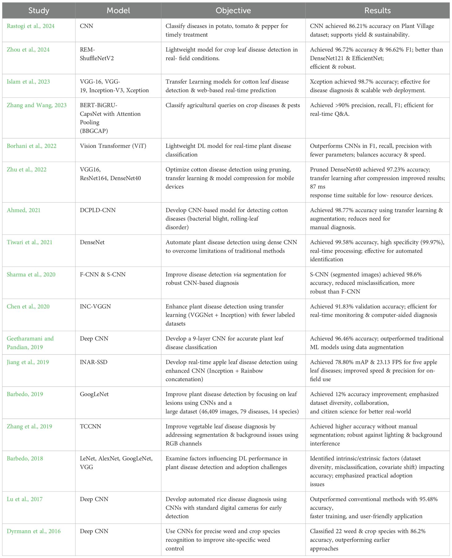 Many researchers employed well-known deep learning architectures for plant disease classification, including AlexNet, VGGNet, InceptionV3, ResNet, and DenseNet (Nigam et al., 2023; Too et al., 2018). Deep neural approaches are extensively utilized in diverse applications like image processing, autonomous driving, healthcare, and more.