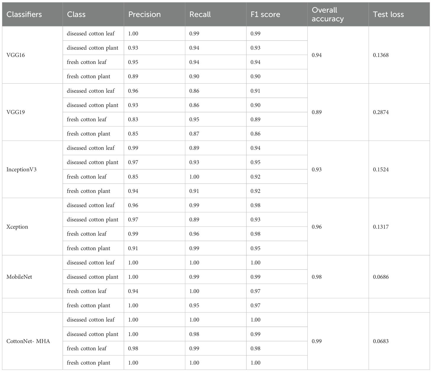 The proposed Deep Learning based automated model is very fast, less expensive, and reliable for identifying cotton disease for plants and leaves. It can be concluded that CottonNet-MHA is the best-performing model, achieving flawless classification, while MobileNet is a great alternative, offering high accuracy with minimal computational cost.