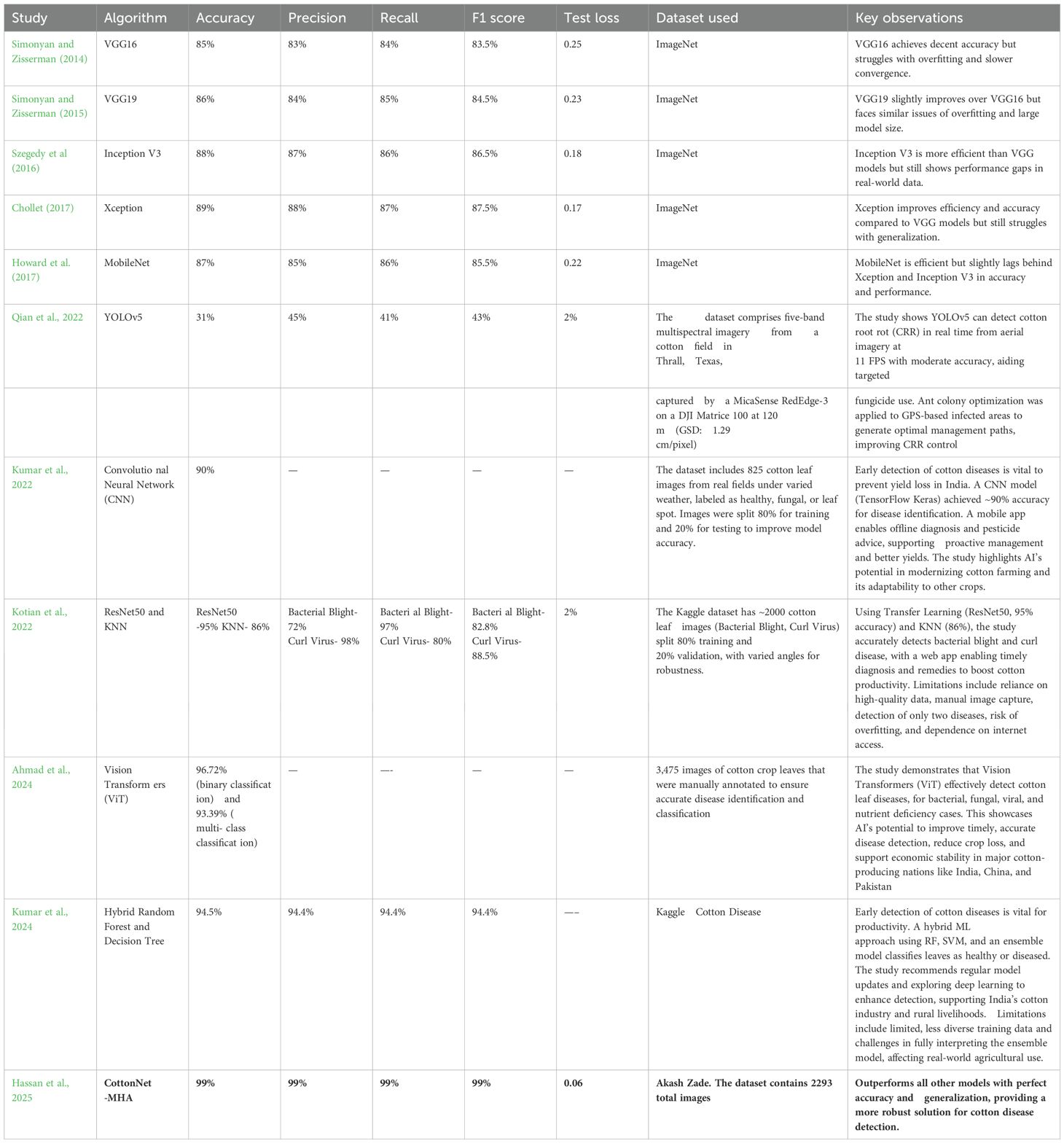 The goal of Islam et al. (2023) is to lower the crop losses and boosting cotton production in areas like Bangladesh, the suggested deep learning-based cotton leaf disease identification method makes use of improved Transfer Learning models (VGG-16, VGG-19, Inception-V3, and Xception) to boost accuracy and facilitate a web-based intelligent system for real-time prediction of plant diseases. The study demonstrates that refined deep learning models—particularly Xception, which has an accuracy of 98.70%—effectively identify cotton leaf diseases, facilitate real-time predictions through a web-based application, and provide a scalable framework for crop disease diagnosis. Despite its high accuracy, the suggested cotton disease detection model has drawbacks, including class imbalance, poor flexibility, insufficient feature extraction, and the requirement for sophisticated image pre- processing techniques like segmentation, which highlight areas for further development. To increase agricultural productivity and sustainability, future research on cotton disease detection should address class imbalance, improve feature extraction, integrate advanced pre-processing, improve adaptability to novel diseases, integrate IoT for real-time monitoring, expand to other crops, and investigate hybrid deep learning approaches.
