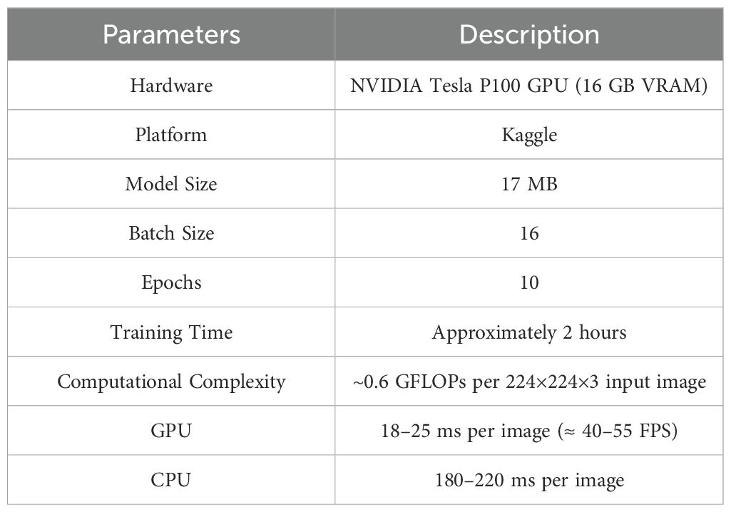 Table 5. Hardware specifications, training parameters, and computational complexity of the CottonNet-MHA model.