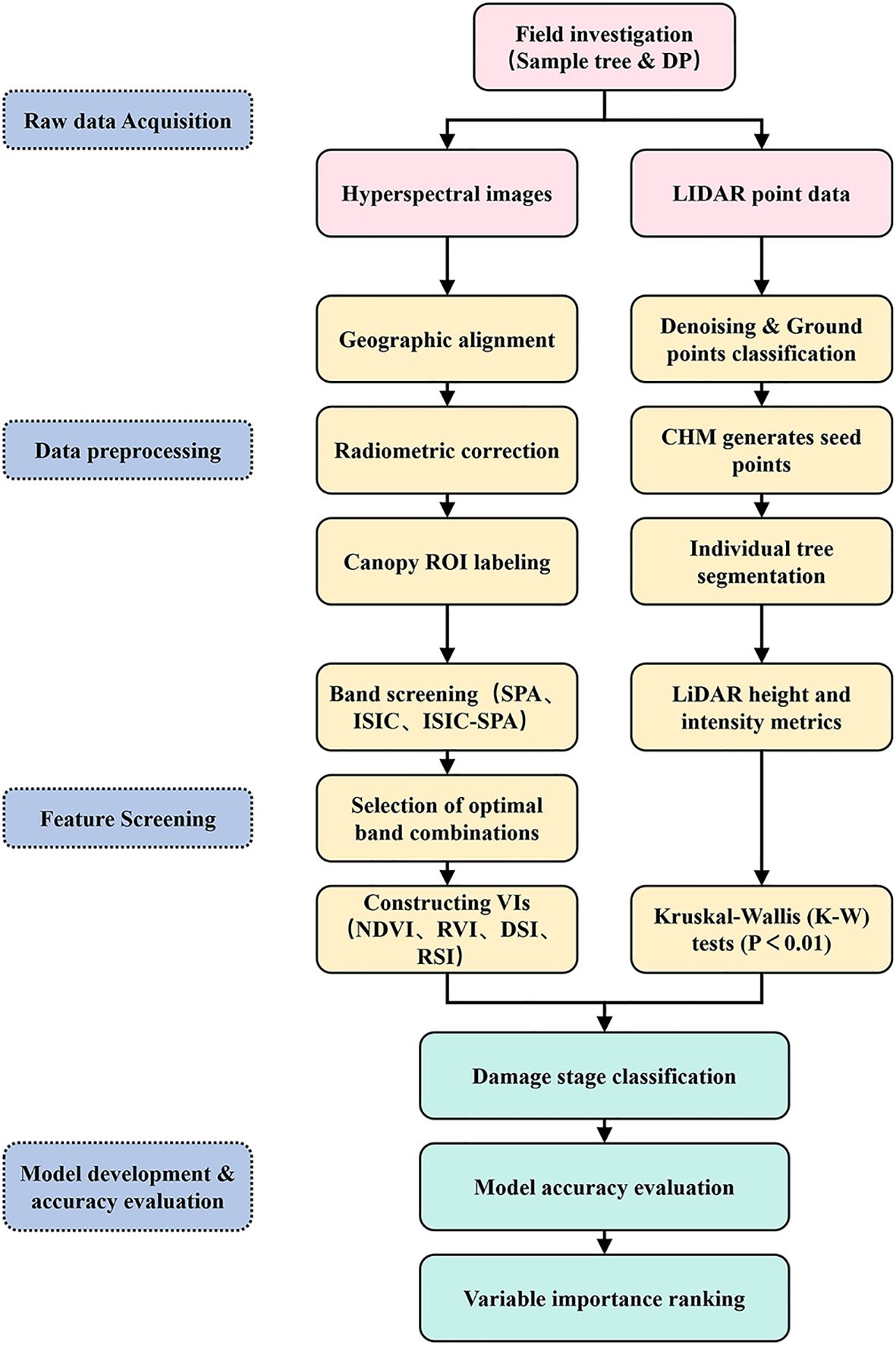 Based on the characteristic of Dendrolimus spp. damage leads to needle loss, this study aim to investigate the role of HSI and LiDAR data in the early monitoring of Dendrolimus spp. The objectives are: (1) to identify the most sensitive HSI bands and LiDAR structural indices for detecting the early stage of Dendrolimus spp. infestation at the individual tree level; (2) to compare the differences between HSI and LiDAR in early monitoring of Dendrolimus spp.; (3) to explore the potential of integrating HSI and LiDAR data for monitoring Dendrolimus spp. in early damage stages.