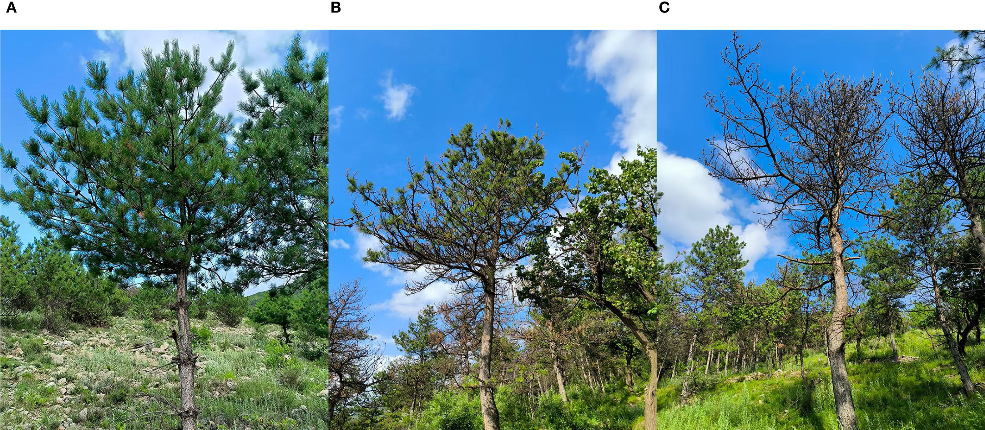 Figure 3. The three stages of damage in P. tabuliformis. (A) Mild damage stage; (B) Moderate damage stage; (C) Severe damage stage.