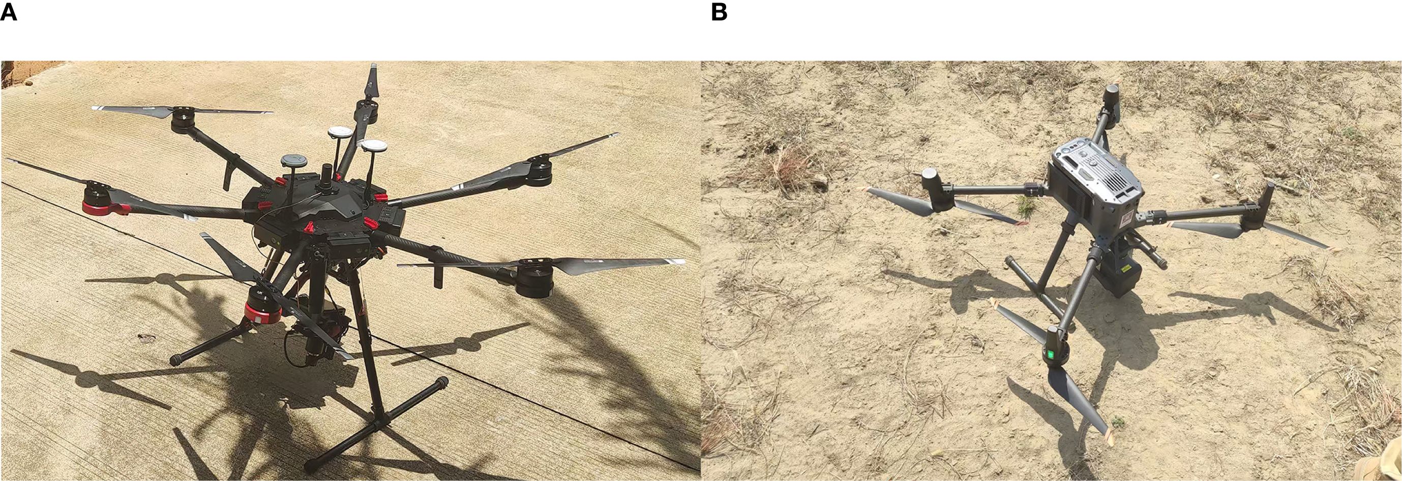 Figure 4. UAV hyperspectral and LiDAR systems. (A) DJI Matrice M600 Pro (HSI); (B) DJI Matrice 350 RTK (LiDAR).