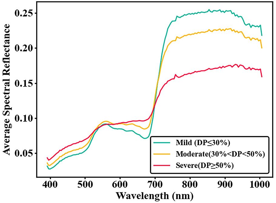 Hyperspectral data provide rich spectral information (Figure 5). However, adjacent bands are often highly correlated, leading to significant redundant information and computational complexity (Lorencs et al., 2018; Han et al., 2022). Compared to feature extraction, band selection preserves the original hyperspectral features and biophysical significance (Li et al., 2022). This method eliminates redundant information and accelerates analysis speed. In this study, the Successive Projections Algorithm (SPA) (Jiang et al., 2022; Ma et al., 2022; Bai et al., 2024) and the Instability Index between Classes (ISIC) (Zhang et al., 2018, 2019; Wang et al., 2023) were applied to screen full-band data. Based on experimental results, the ISIC-SPA (Zhang et al., 2018) method was further utilized for secondary band selection.