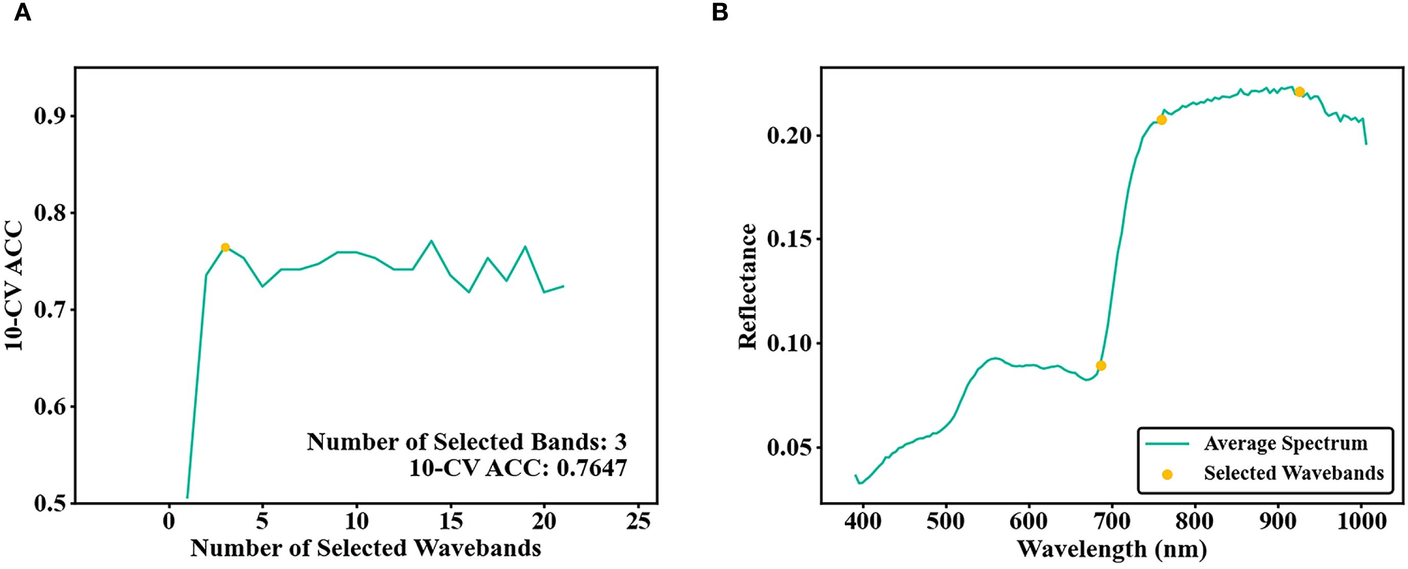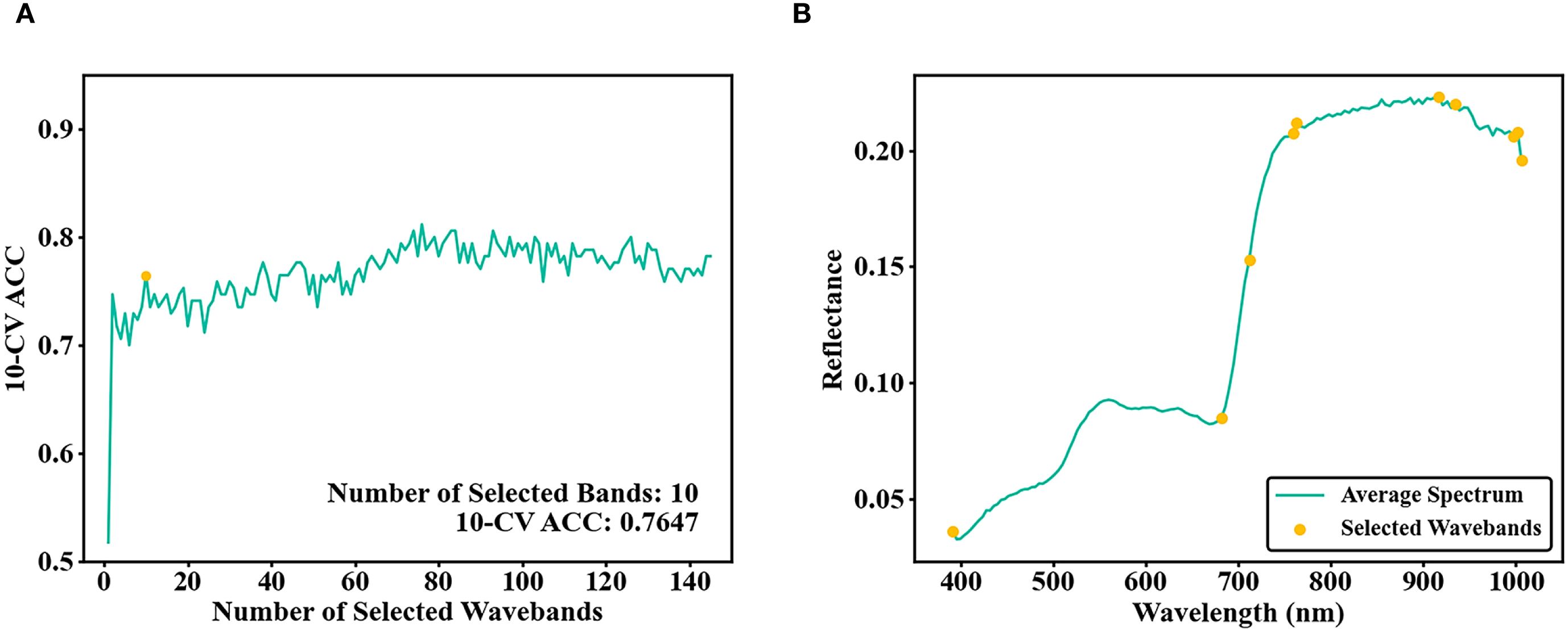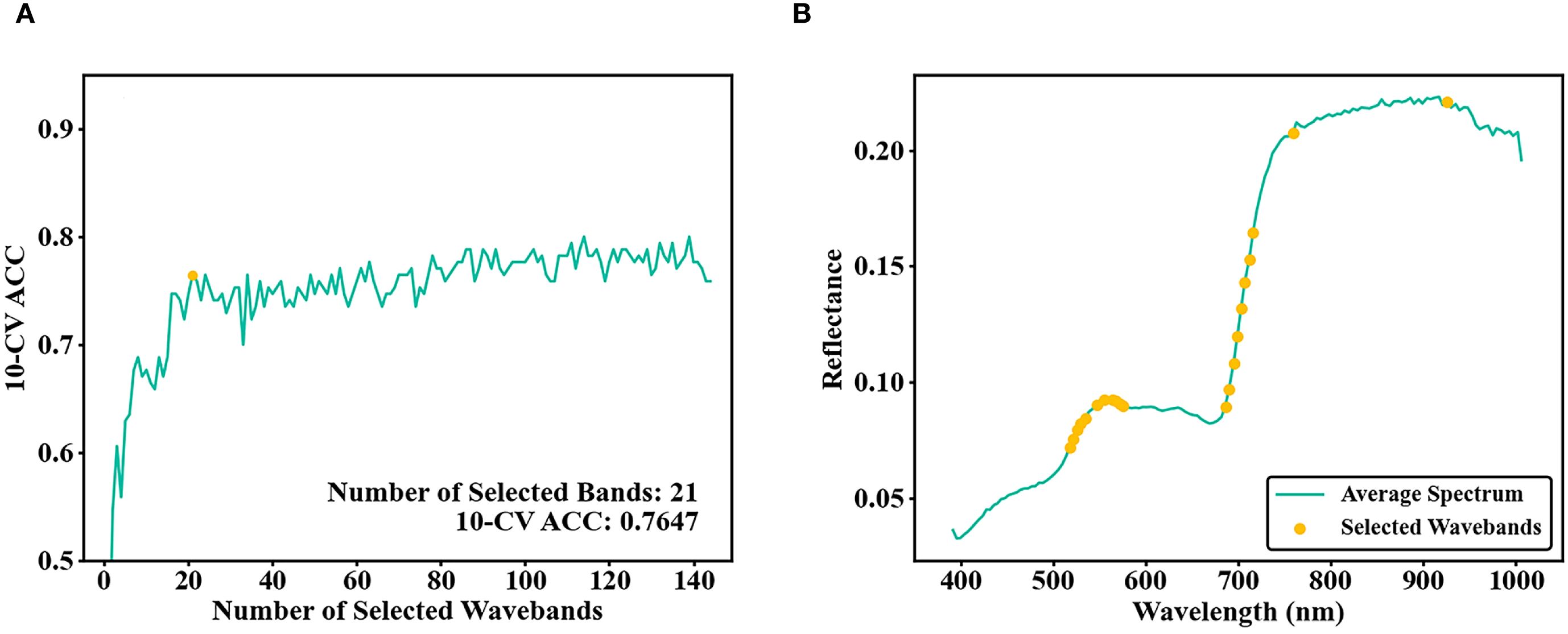 Figure 7. (A) Number of bands selected by ISIC and 10-CV ACC of the training set; (B) ISIC selected bands.