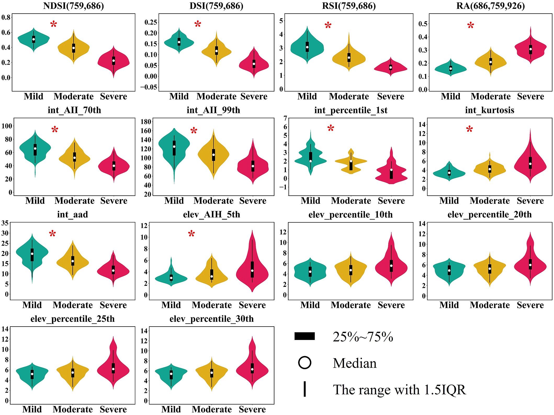 Figure 9. Vegetation indices and LiDAR metrics across three stages of damage. The symbol * indicates significant differences between mild and moderate stages.