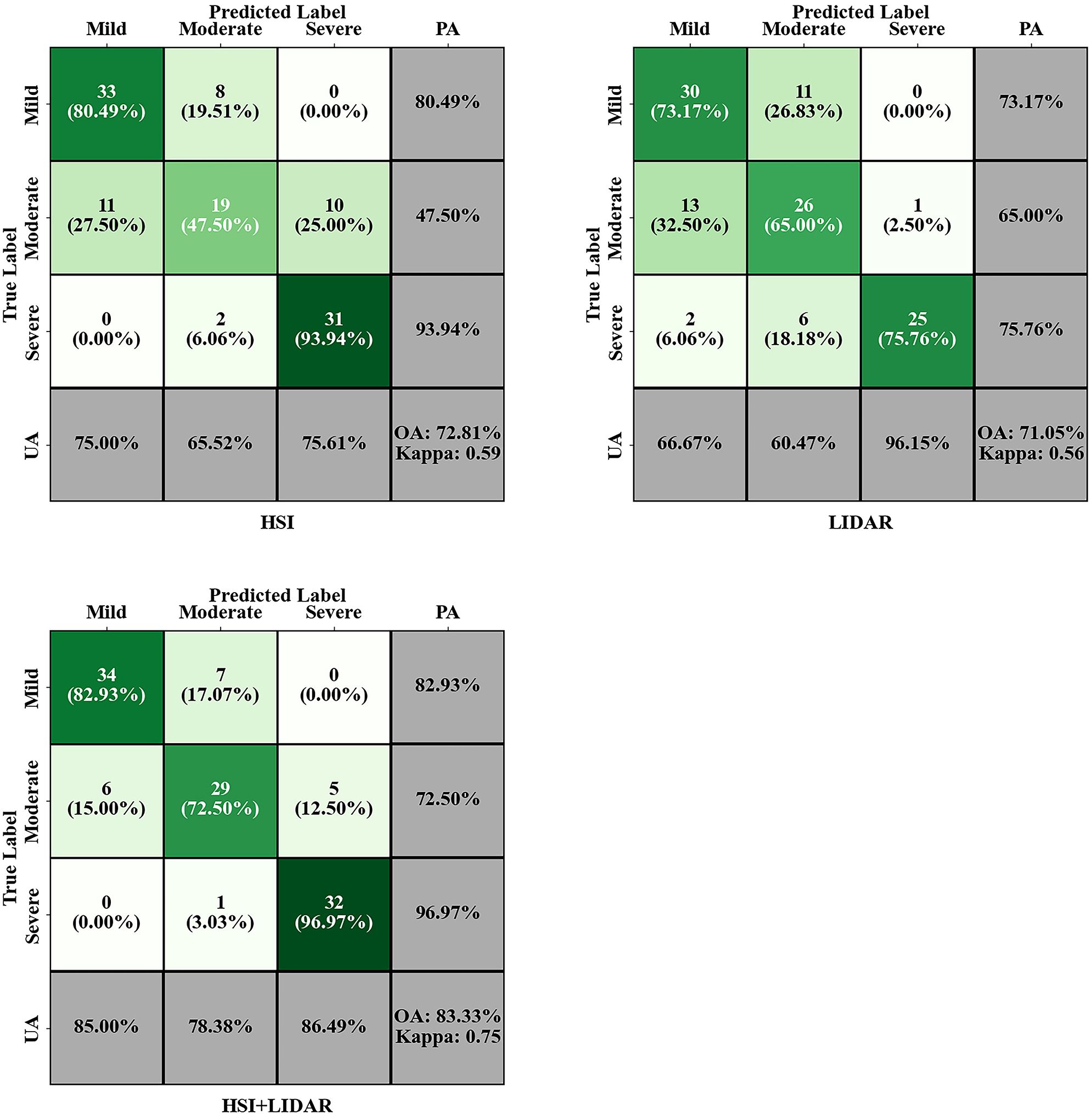 The classification model built with the combined dataset of HSI bands and LiDAR metrics achieved an OA of 83.33% and a Kappa of 0.75, with the confusion matrix shown in Figure 10. The severe stage showed the best classification performance with an accuracy of 96.97%. The mild stage achieved an accuracy of 82.93% with eight samples misclassified as moderate. The moderate stage exhibited the poorest classification results. Compared to using VIs alone, this method increased OA by 10.52%, improved accuracy for mild and severe stages by 2.44% and 3.03% respectively, and raised accuracy for the moderate stage by 25%.