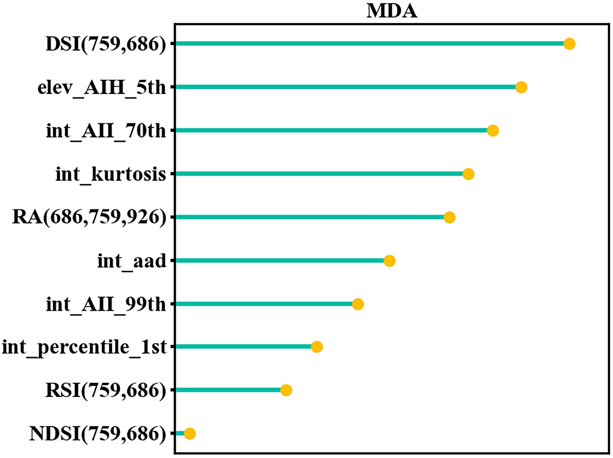The importance ranking of selected features using MDA in the RF model is shown in Figure 11. DSI (759, 686) was the most important HSI variable. Among LiDAR metrics, the elev_AII_5th is the most significant.