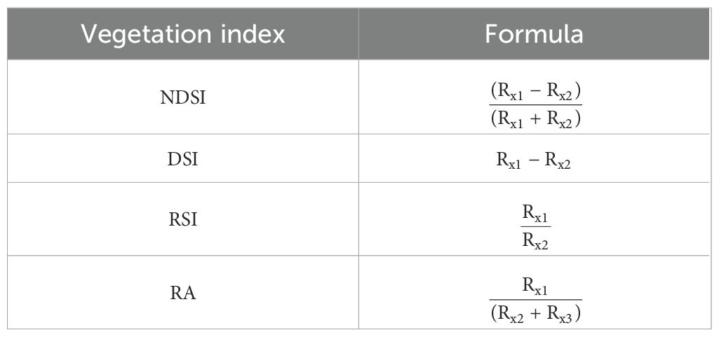 To enhance the information contained in the spectral bands and reduce the influence of factors such as soil background, 4 band combination methods were selected based on previous studies and as shown in Table 1. All possible combinations of these bands were generated, and Spearman correlations between each vegetation index (VI) and three damage stages of P. tabuliformis were analyzed. The VI with the highest correlation in each category was selected as a classification variable (Ma et al., 2021).
