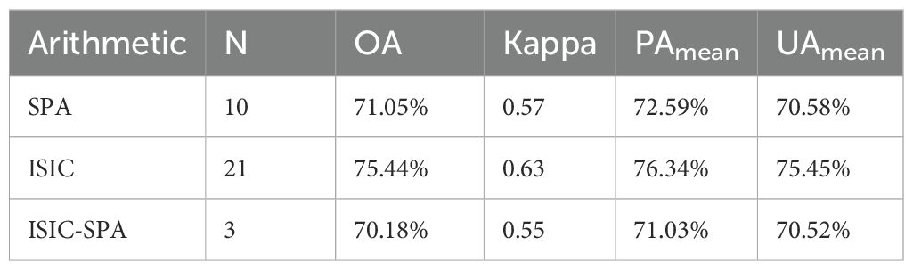 The RF model based on the ISIC method showed the best performance. It had the highest OA, Kappa, UAmean, and PAmean. OA reached 75.44%, and Kappa was 0.63. The SPA method performed second best. OA and Kappa were 71.05% and 0.57 respectively. The ISIC-SPA method achieved only 70.18% OA. However, it used only 3 bands. This was much fewer than the 21 bands for ISIC and 10 bands for SPA. Therefore, considering both accuracy and band number, the 3 band ISIC-SPA method was selected for further vegetation index construction.