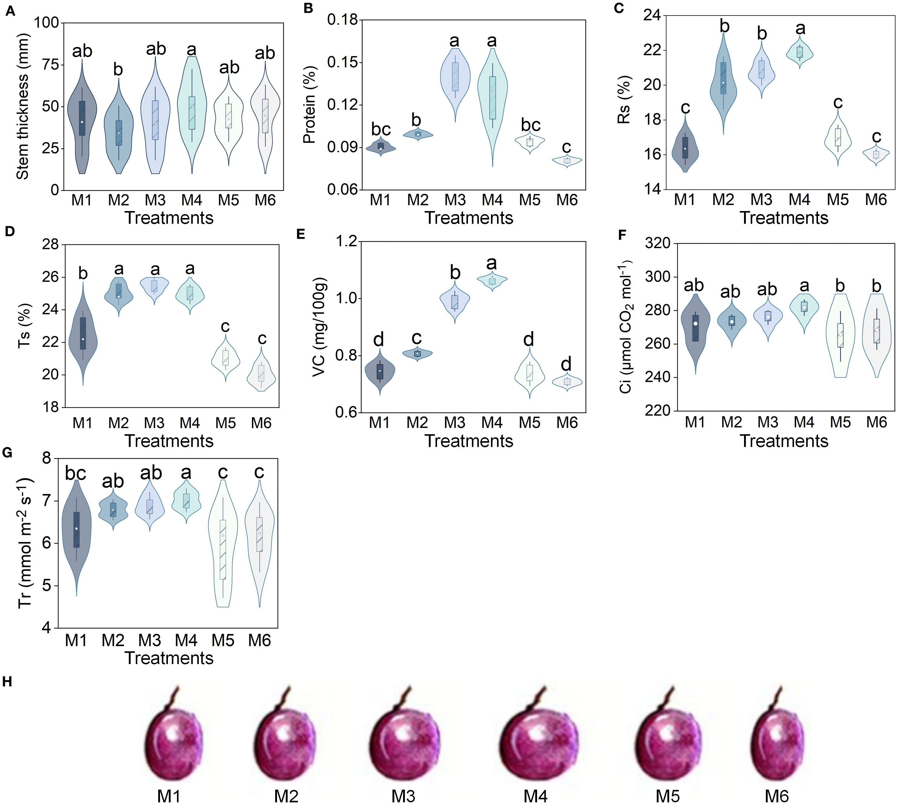 Fruit quality (protein, Rs: reducing sugars, Ts: total sugar, VC: Vitamin C) showed a unimodal trend across treatments. The M4 treatment yielded the highest levels of Rs and VC (21.87% and 1.06%), which were 36.43% and 49.30% greater than those in the M6 treatment. Meanwhile, the M3 treatment produced the highest protein and Ts contents (0.14% and 25.50%), exceeding the M6 values by 48.94% and 27.50%. (P < 0.05, n=6; Figures 1B–E).