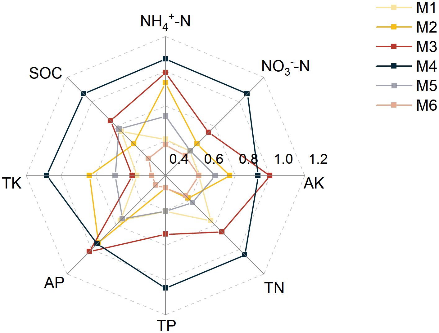 Figure 2. Radar plot of membership value of indicators. SOC, soil organic carbon, TN, total nitrogen; TP, total phosphorus; AP, available phosphorus; TK, total potassium; AK, available potassium; NH4+-N, ammonium nitrogen; NO3–N, nitrate nitrogen. The treatment codes, M1-M6, are consistent with those in Figure 1.