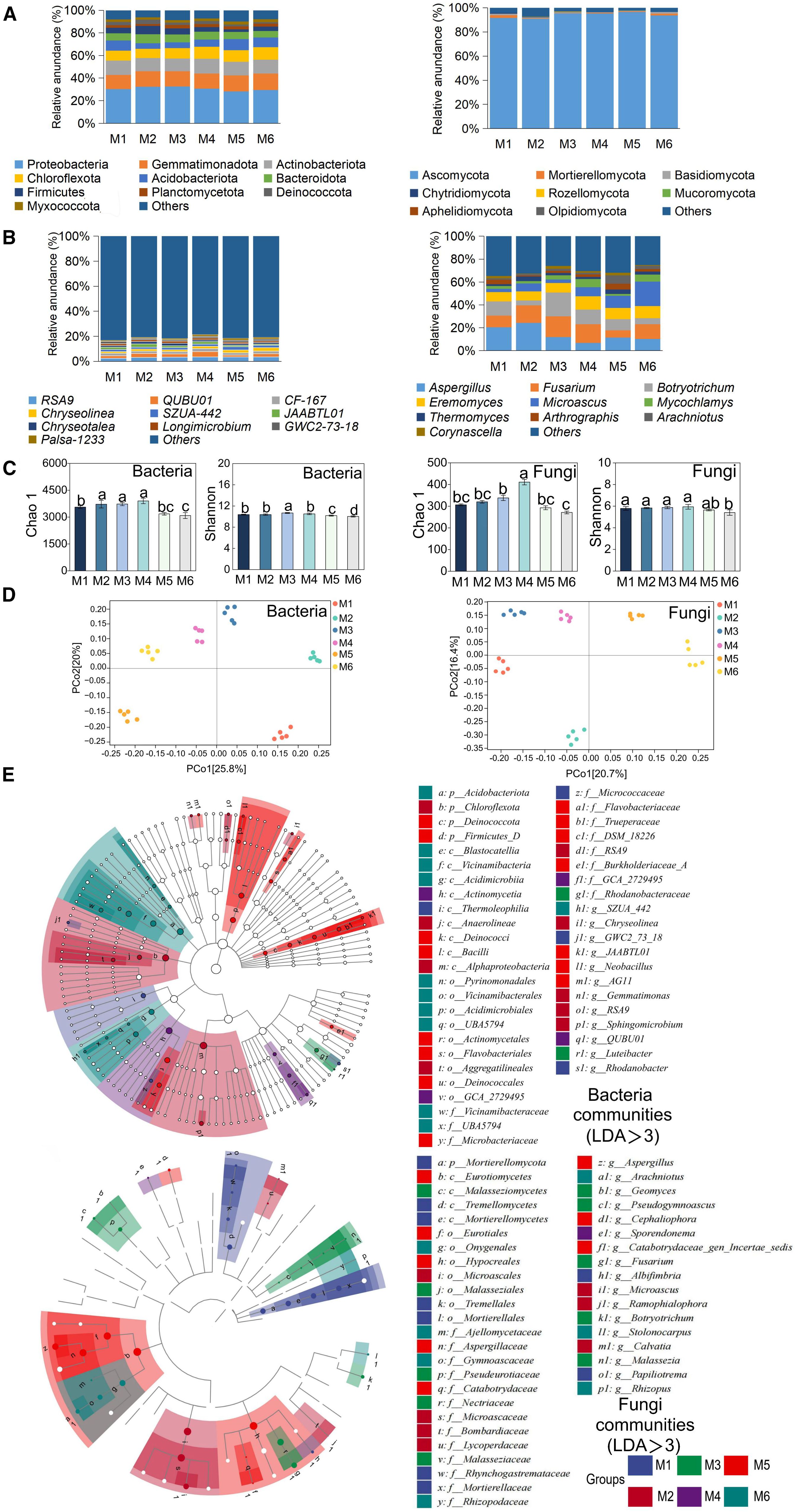 Figure 3. Effects of different treatments on microbial communities. (A) Relative abundance of major bacterial (left) and fungal (right) phyla between different treatments. The large circle indicates high abundance. (B) Relative abundance of major bacterial (left) and fungal (right) genera between different treatments. (C) Comparison of bacterial and fungal community diversity between different treatment areas. (D) PCoA analysis of bacterial (left) and fungal (right) communities based on Bray-Curtis distance. (E) bacterial and fungal biomarker taxa composition under different treatments. Circles from inside to outside represent taxonomic levels from phylum to genus. Each small circle at a different taxonomic level represents a taxonomic unit at that level, and the size of the circle diameter is proportional to the size of the relative abundance. Species without significant differences are uniformly white. Species names indicated by letters in the figure are shown in the legend on the right, and only species with LDA scores of >3 for differences are shown. Different letters indicate significant differences among treatments (P < 0.05, n = 6, Tukey HSD). The treatment codes, M1-M6, are consistent with those in Figure 1.
