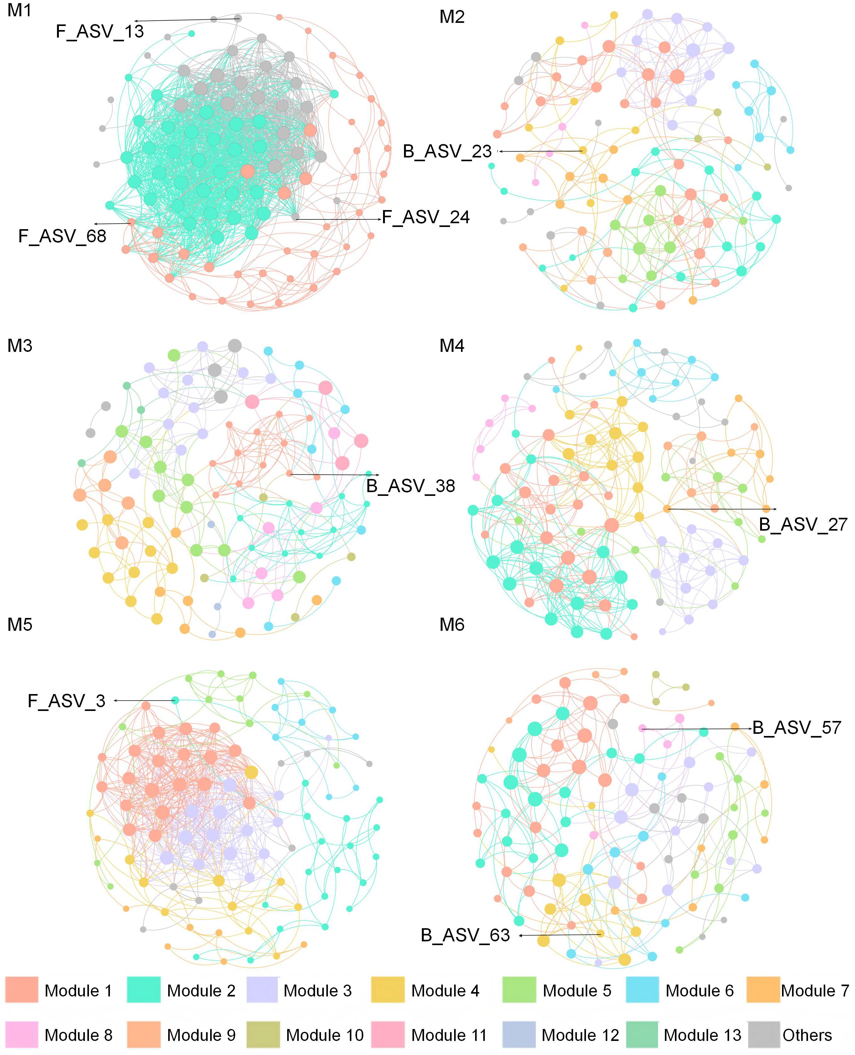 Figure 4. Bacterial and fungal co-occurring networks under each treatment. The treatment codes, M1-M6, are consistent with those in Figure 1.
