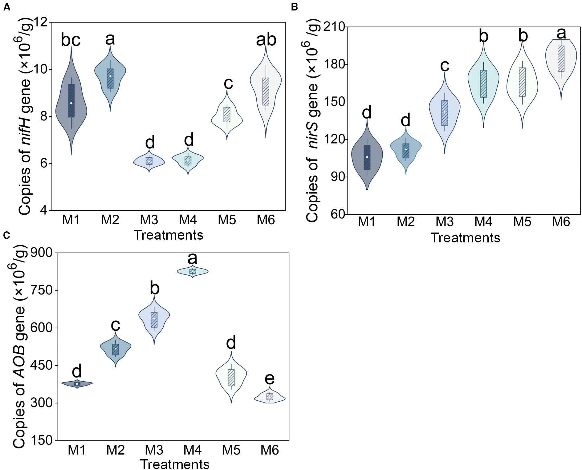 Figure 5. Absolute abundance of (A) nifH, (B) nirS, and (C) AOB gene under different treatments. Different letters indicate significant differences between treatments (P < 0.05, n = 6, Tukey HSD). The treatment codes, M1-M6, are consistent with those in Figure 1.