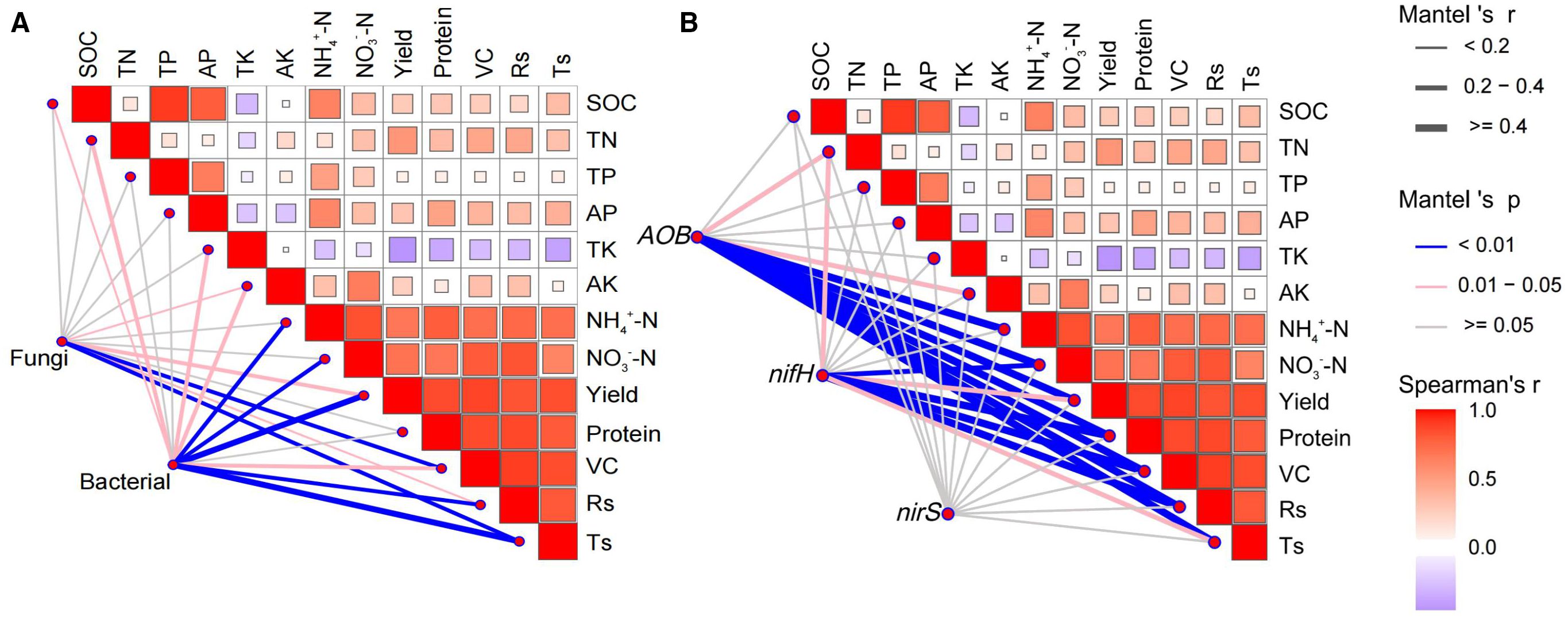 Figure 6. Relationships between (A) microbial communities, (B) nitrogen cycling genes, and fruit quality, yield, and soil nutrients based on Spearman correlation and Mantel test. SOC, soil organic carbon; TN, total nitrogen; TP, total phosphorus; AP, available phosphorus; TK, total potassium; AK, available potassium; NH4+-N, ammonium nitrogen; NO3–N, nitrate nitrogen; VC, Vitamin C, Rs, reducing sugar; Ts, total sugar.