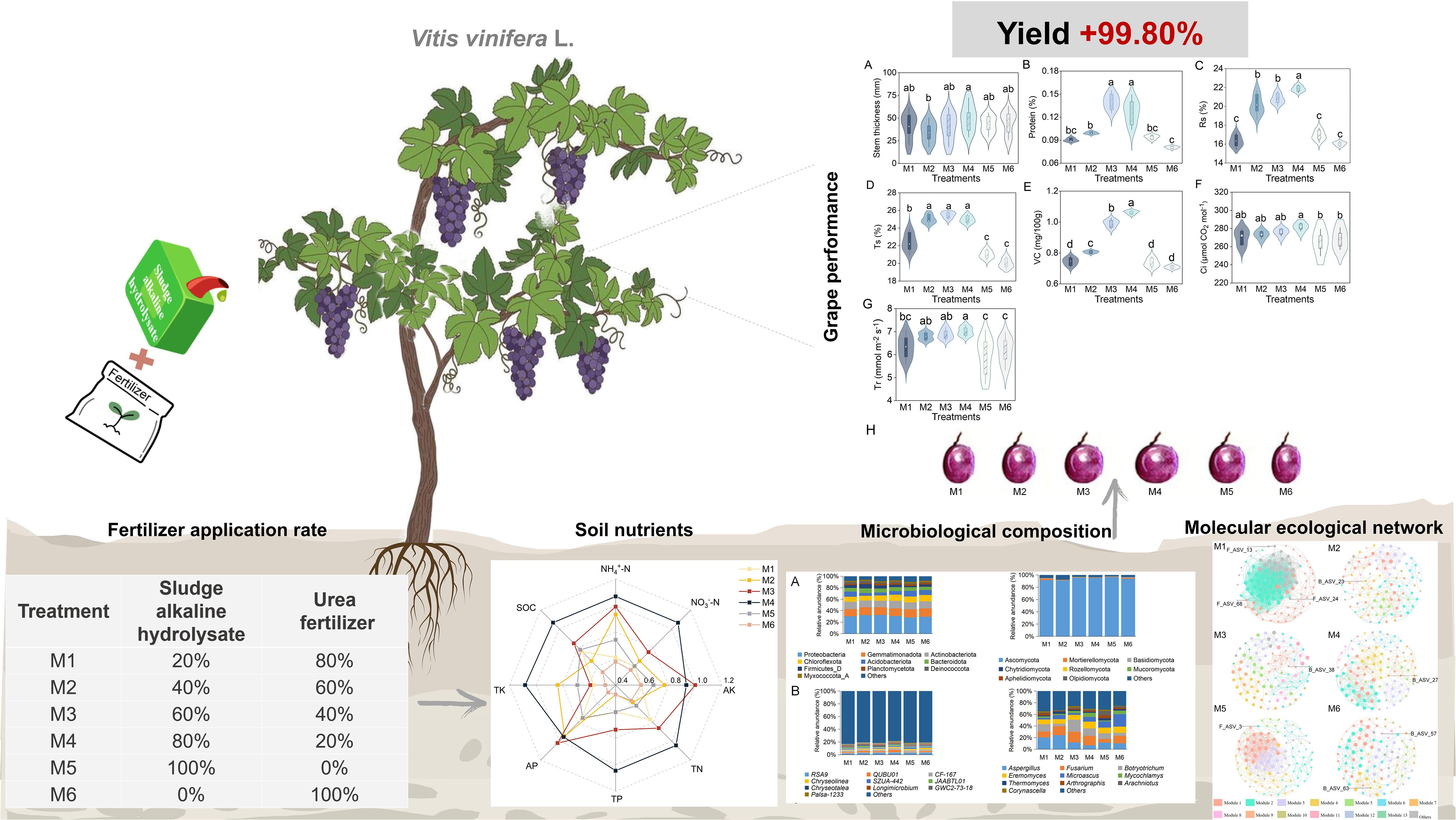 Given these gaps, we designed a study to assess the impact of varying SAH and urea ratios on grape performance, soil chemistry, and microbial dynamics. Specifically, the objectives are to (1) evaluate the effects of different treatments on grape performance (stem thickness, leaf area, fruit shape index, yield, chlorophyll, fruit quality and photosynthetic characteristics), (2) elucidate response mechanisms of soil nutrients, microbial communities, and nitrogen-cycling functional genes to different treatments; and (3) identify the key factors influencing grape performance across different treatments. This study demonstrates that blending the novel sludge alkaline hydrolysate fertilizer and urea enhances grape performance through multiple mechanisms, offering a sustainable approach for grape productivity improvement.