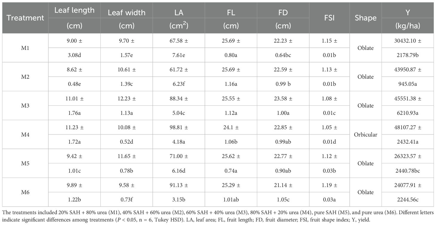 Crop stem thickness and leaf area (LA) are associated with high crop yield and quality, and they are key indicators for assessing crop growth and predicting yield (Pei et al., 2024). Plants with thicker stems can store more water and nutrients, and they have high stress resistance and load-bearing capacity (Li et al., 2022b). The LA can regulate photosynthetic efficiency, further affecting yield (Ren et al., 2025). The fruit shape index (FSI), defined as the ratio of longitudinal to transverse diameter, serves as a key morphological indicator in fruit characterization (Croce et al., 2024). The FSI closer to 1 indicates a more orbicular fruit morphology. The contents of sugar, vitamins, and other nutrients in the fruit have a considerable influence on the taste and flavor of the fruit, and protein, Vitamin C (VC), reducing sugar (Rs), and total sugar (Ts), which are generally the main evaluation indices (Zhang et al., 2024b; Balık et al., 2023).