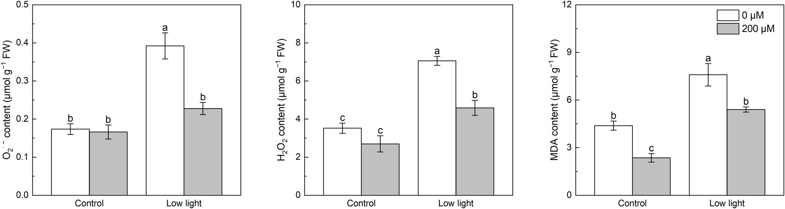 Effect of melatonin application on the content of leaf superoxide anion (O2·-), hydrogen peroxide (H2O2) and malonaldehyde (MDA) in tobacco seedlings under low light. Different letters represent significant differences at the P < 0.05 level. Values are means ± SE (n = 3).
