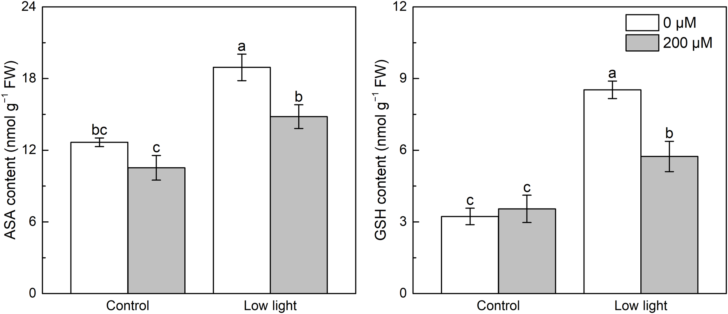 Effect of melatonin application on the content of leaf ascorbate (AsA) and glutathione (GSH) in tobacco seedlings under low light. Different letters represent significant differences at the P < 0.05 level. Values are means ± SE (n = 3).